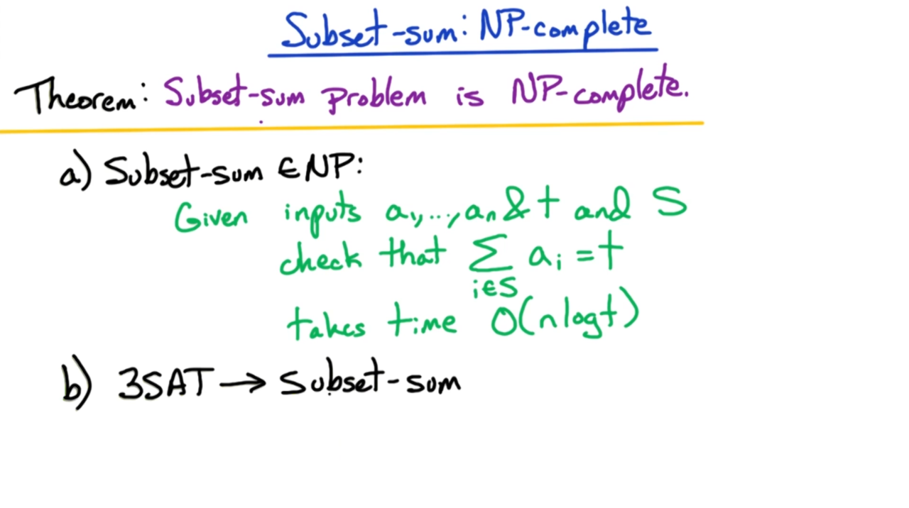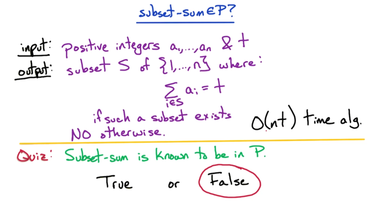 首先我们需要证明subset-sum是NP完备问题。subset-sum问题是指在正整数集合\(S = \{ a_1, ..., a_n \}\)中找出和为$t$的一个子集。显然这个问题可以使用动态规划进行求解,它的复杂度为$O(nt)$。不过需要注意的是类似于knapsack问题,subset-sum不是一个P问题。