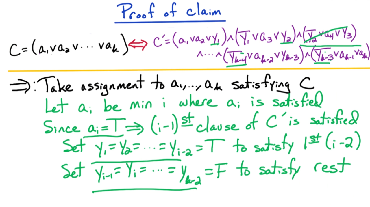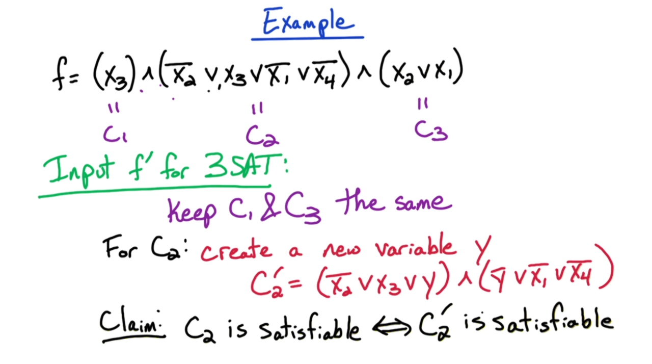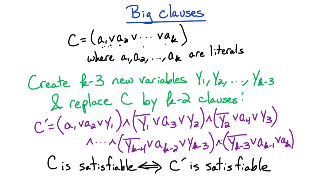 实际上对于包含k个变量的从句$C$我们都可以把它转换为只包含3个变量的从句$C’$: