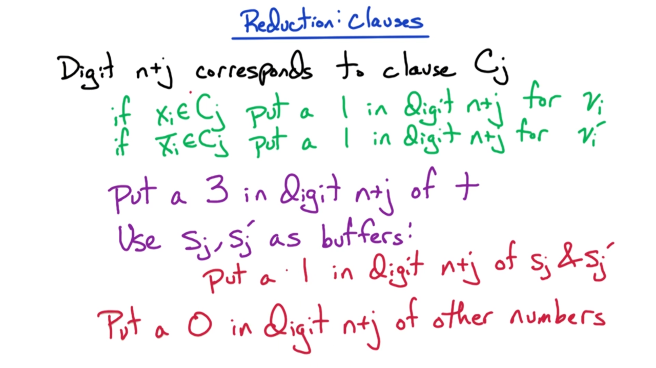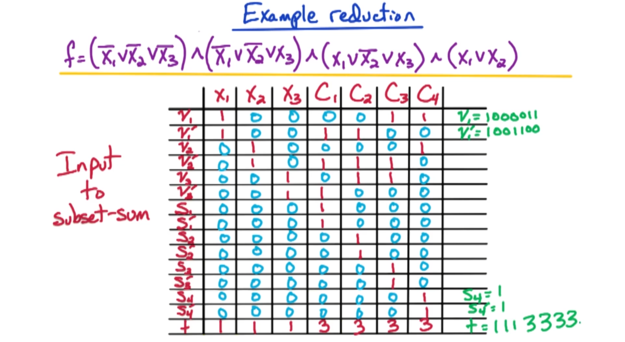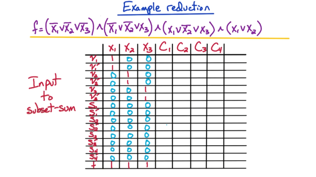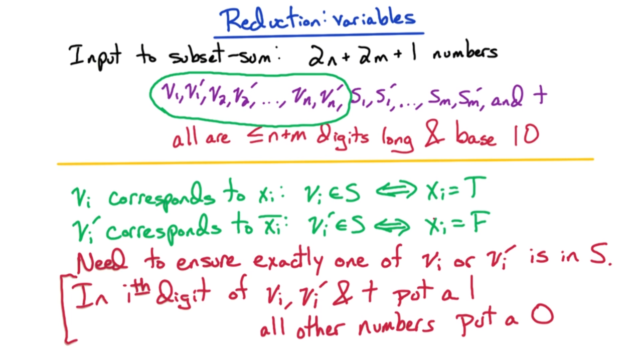 接下来我们开始证明subset-sum是NP完备问题。显然我们可以在多项式时间内验证subset-sum的解,因此它是一个NP问题;然后利用归约可以证明3SAT会归约到subset-sum上,这样就证明了subset-sum是NP完备问题。