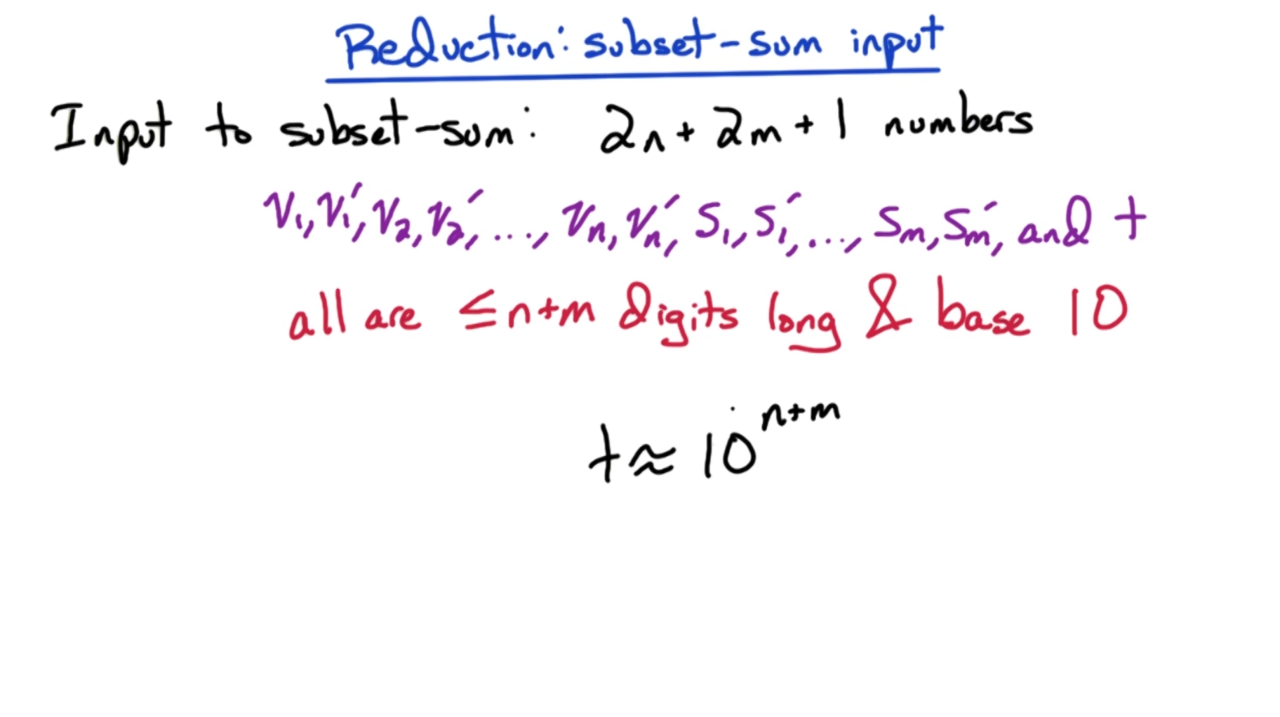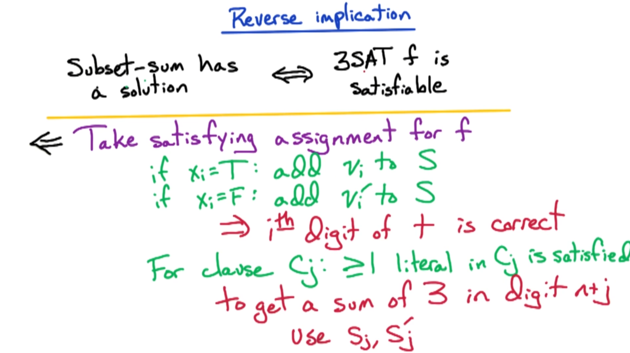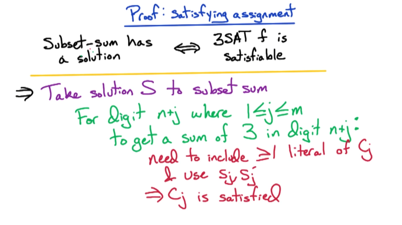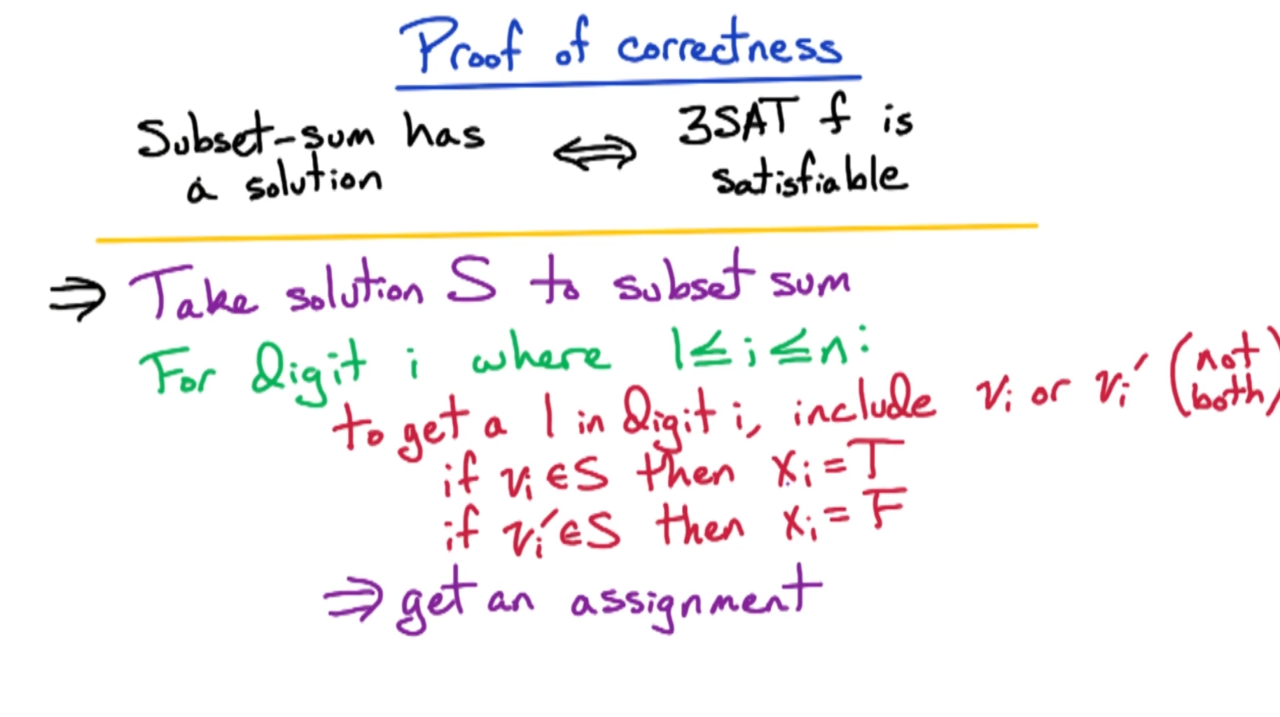 接下来我们开始证明subset-sum是NP完备问题。显然我们可以在多项式时间内验证subset-sum的解,因此它是一个NP问题;然后利用归约可以证明3SAT会归约到subset-sum上,这样就证明了subset-sum是NP完备问题。