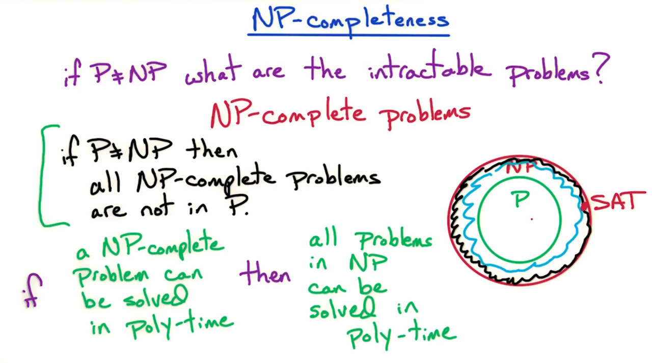 如果P≠NP那么在NP问题中一定存在一些难以求解的问题,称为NP完备(NP-completeness)问题。用Venn图来表示的话NP完备问题是NP问题和P问题的差集。NP完备问题是NP问题中最困难的问题,显然如果P≠NP那么NP完备问题一定不是P问题。它的逆否命题则说明如果能够找到一个NP完备问题在多项式时间内的解,那么所有NP问题都是P问题,即P=NP。