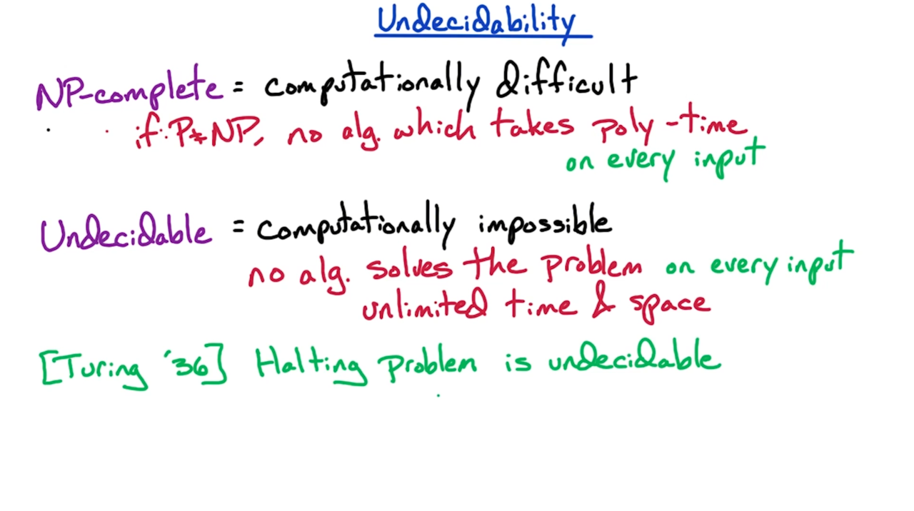NP完备问题是在计算上非常困难的一类问题。如果我们承认P≠NP,那么NP完备问题不存在对于任意输入的多项式时间解法。而不可判定问题(undecidable problem)则是更加困难的问题,对于任意输入不可判定问题即使给予无限的时间和空间都不存在求解的算法。图灵在1936年指出停机问题(halting problem)就是这样的一个不可判定问题。