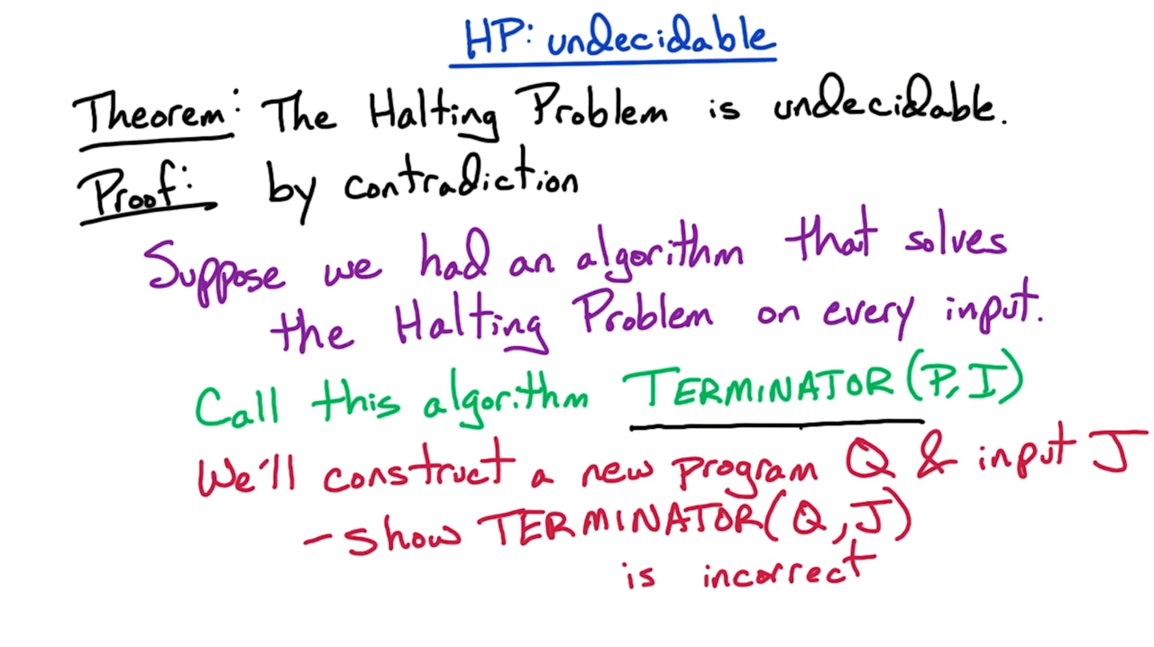 接下来我们利用反证法来证明停机问题是不可判定问题:假设停机问题存在算法TERMINATOR(P, I)进行求解,我们可以构造一个新的程序Q以及输入J使得TERMINATOR无法给出正确的解。