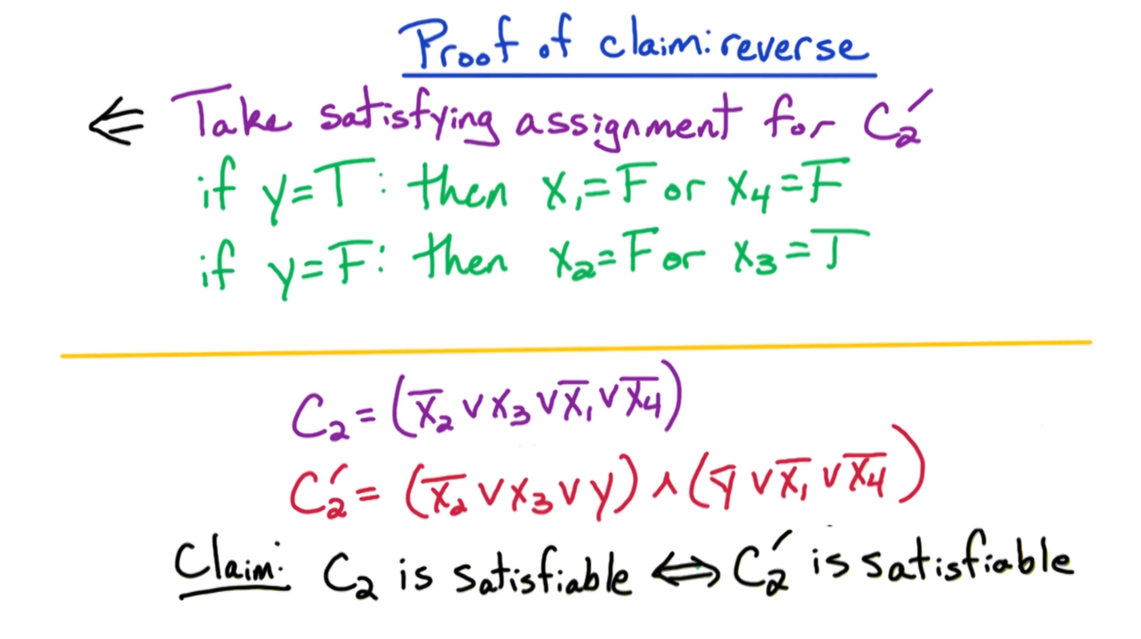 \[C = ( \bar{x}_2 \vee x_3 \vee \bar{x}_1 \vee \bar{x}_4 )\]我们定义一个新的从句$C’$,它由2个只包含3个变量的从句构成: