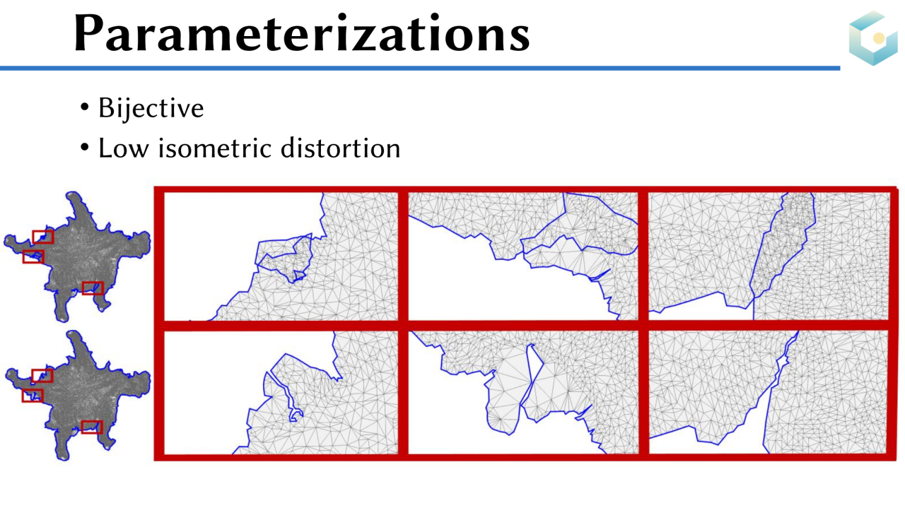 进行参数化时我们可以使用前面介绍过的各种全局单射方法来实现低扭曲的参数化。