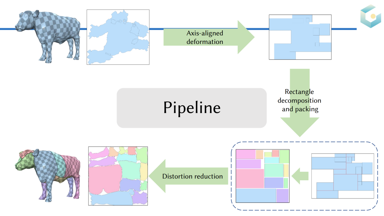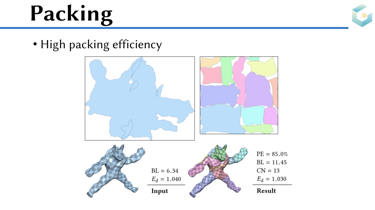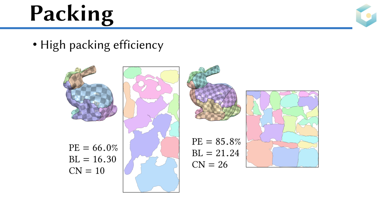 得到每一个分片的参数化后就需要把这些平面图形组装到一张纹理图像中。在进行组装时我们需要考虑摆放效率(packing efficiency, PE),其定义为参数化区域的面积占整个纹理区域面积的比例。显然我们希望PE要尽可能高,这样可以节约存储空间。除了PE之外,边界长度(BL)、切割块数(CN)以及几何扭曲也都可以作为评价摆放结果的指标。
