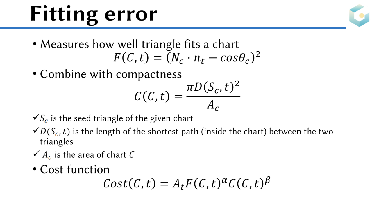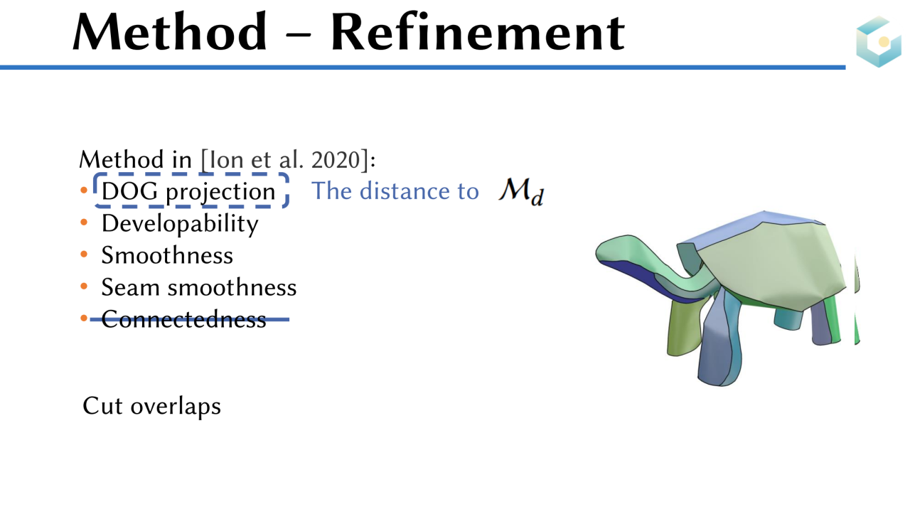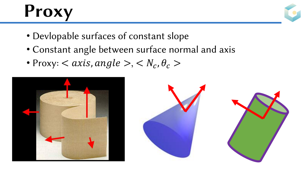因此我们需要一些方法来预测不同表面参数化后的几何扭曲。比如说可以使用分割后区域的轴向以及区域内每个三角形法向之间的差异来进行估计,如果它们的差异为0则说明该区域是一个圆锥曲面对应的几何扭曲为0。