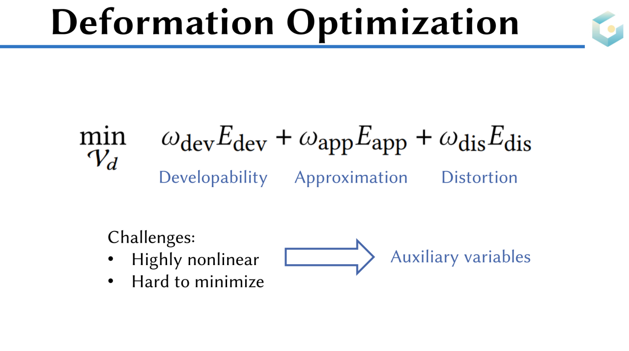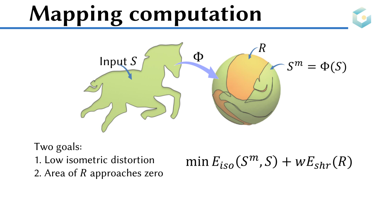 更严格来说,我们需要把一个二维形状映射到球面上同时最小化几何扭曲以及曲面外的面积。