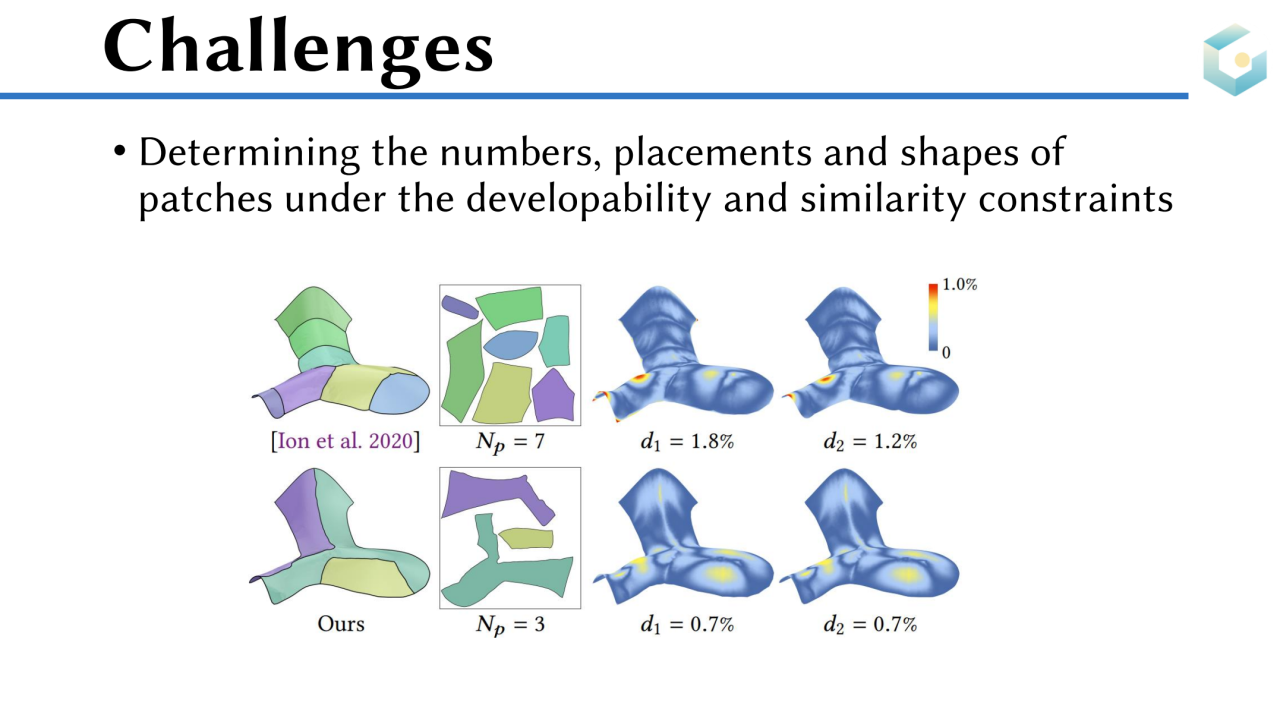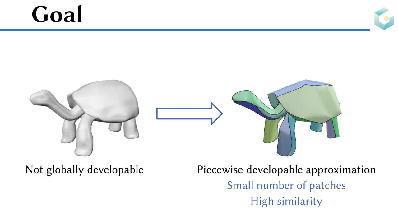 一种更好的策略是从整体出发,首先使用可展曲面对原始形状进行一个近似。然后再进行分割,此时得到的分片曲面都近似于可展曲面。