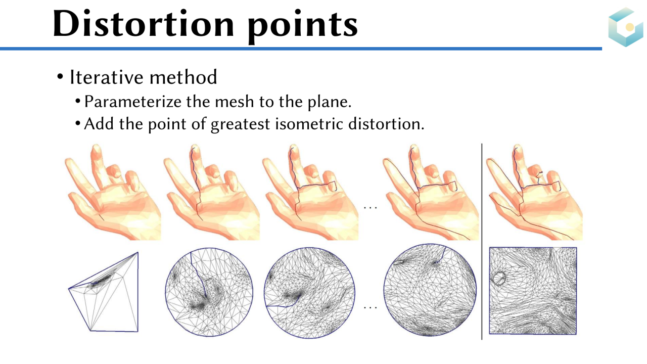 points to path会在网格上寻找一些高扭曲的点,然后把它们连起来对模型进行切割。在寻找高扭曲的顶点时一般会使用一些启发式的算法来进行选取,然后利用最小生成树来将这些点连起来实现切割。