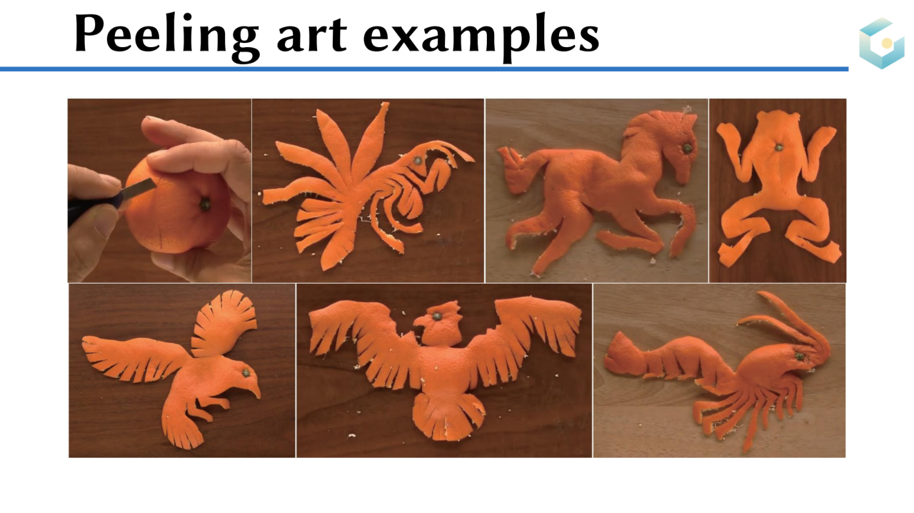 参数化除了在CG领域有广泛应用外也启发了很多艺术创作的思路。比如说艺术家可以在橘子表面上进行雕刻,然后把橘子皮展开就得到了不同形式的图案。