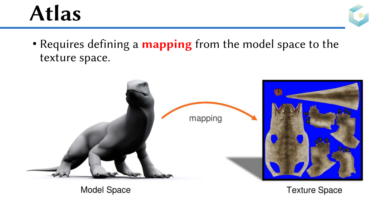 因此atlas可以定义为模型空间到纹理空间的一个映射。当模型的几何比较复杂时直接计算一个全局的参数化可能会比较困难,因此在工业界也会把模型划分为不同的区域分别进行参数化然后记录到一张二维纹理上。