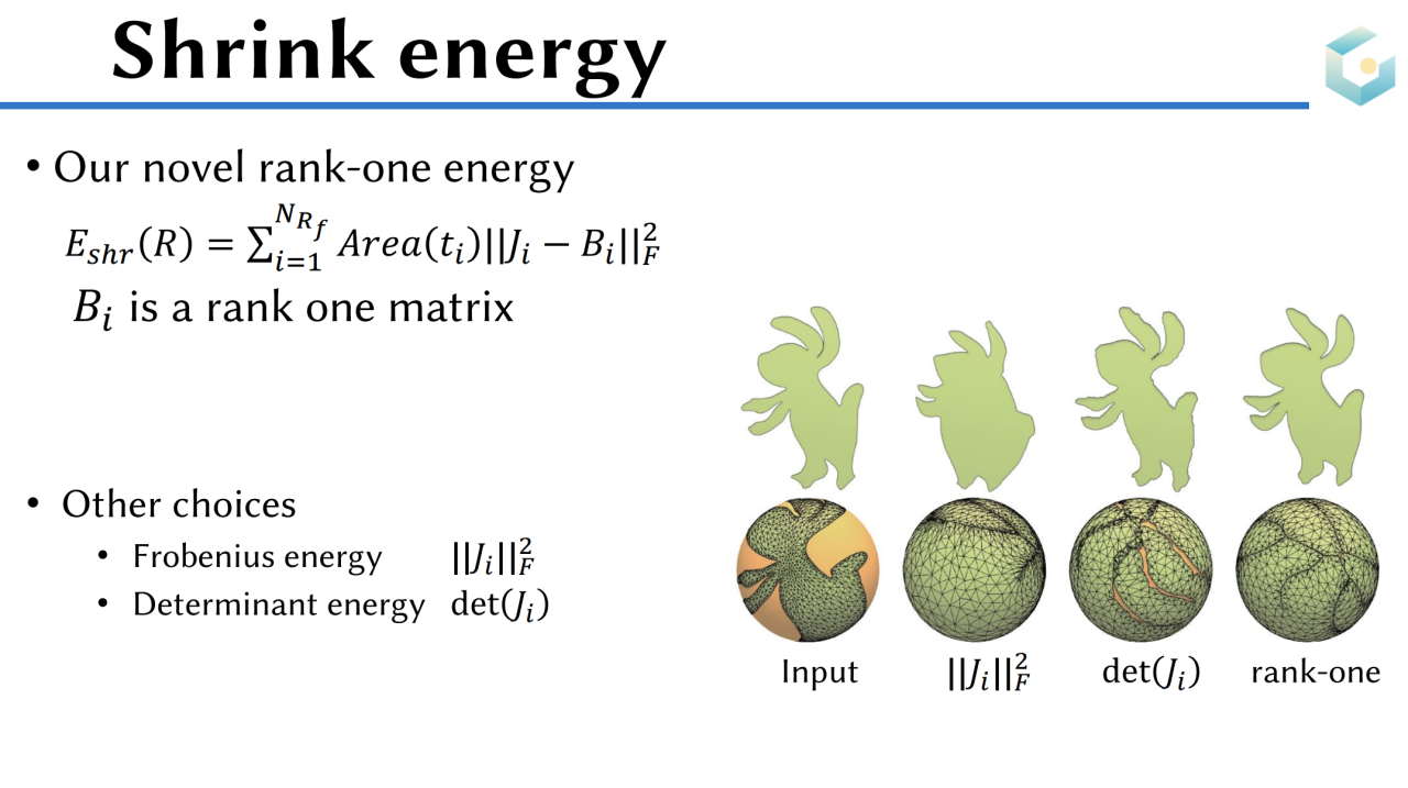 而对于球面上不属于图形的区域,我们希望它的面积尽可能小。这里使用了rank-one energy来使其发生退化。