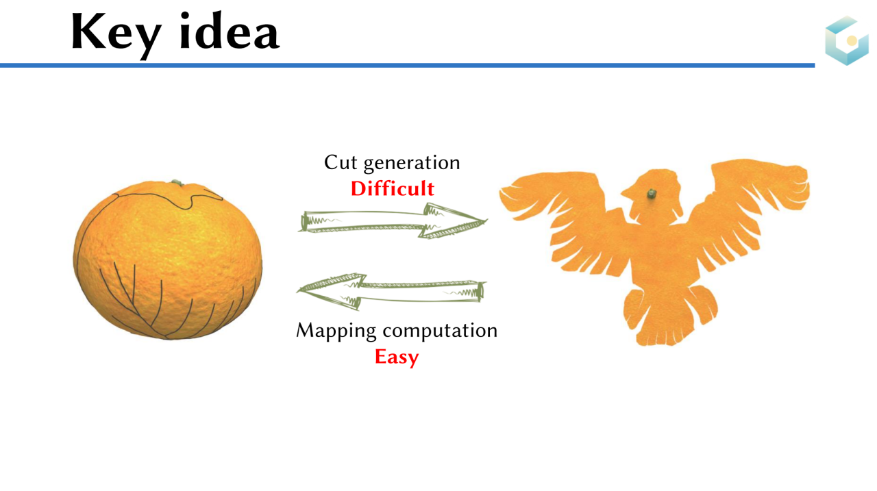 直接生成割缝往往是比较困难的,但把二维形状映射到球面是相对容易的。如果映射后的形状可以完整包住整个球面就得到了所需的割缝。