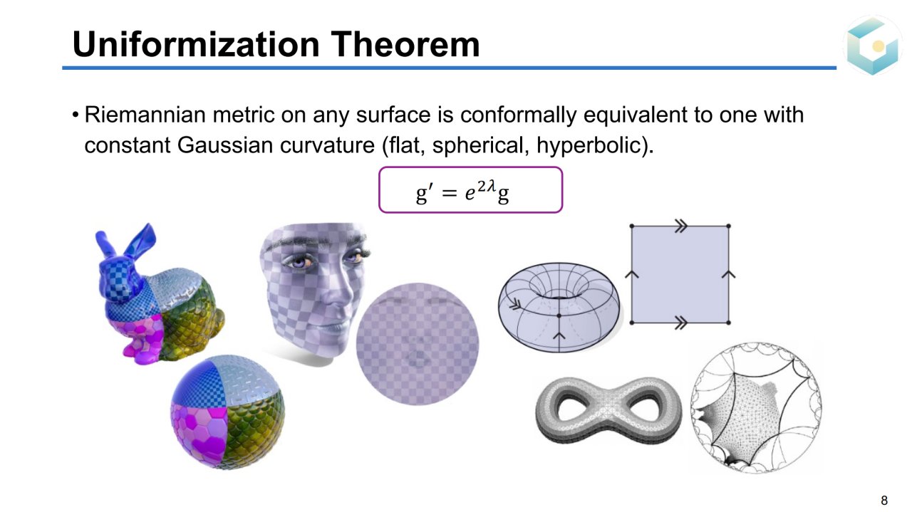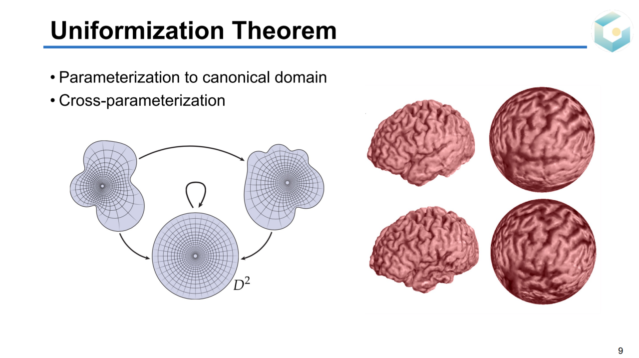 曲面单值化定理(uniformation theorem)指出任意曲面都可以通过共形映射变换到具有常高斯曲率的曲面上。以任意亏格为0的曲面为例,一定存在一个共形映射能够将它映射到球面上。