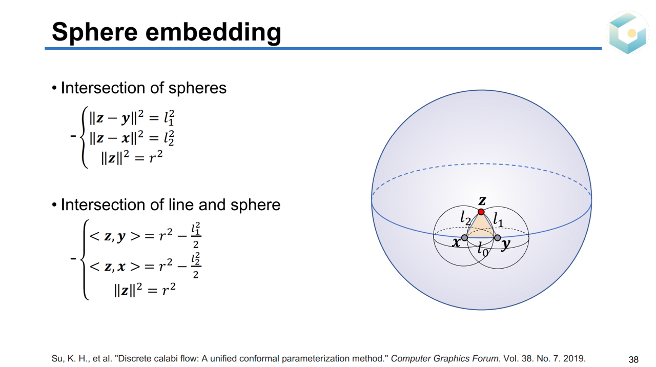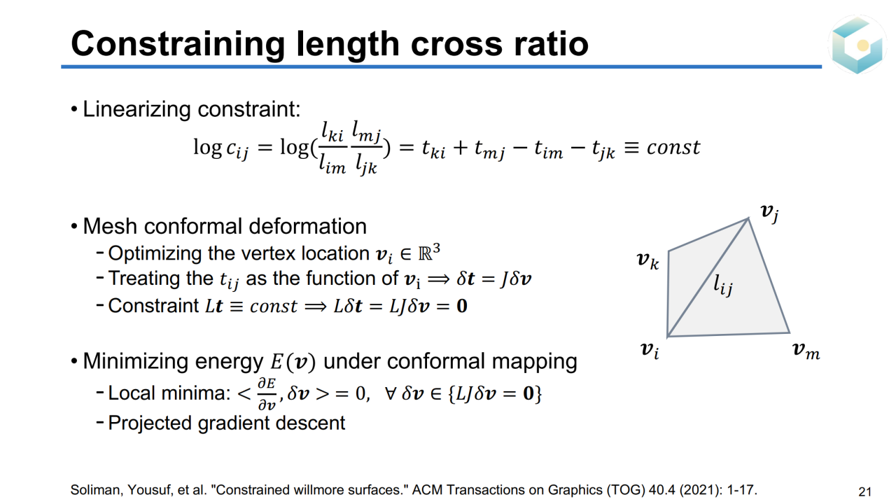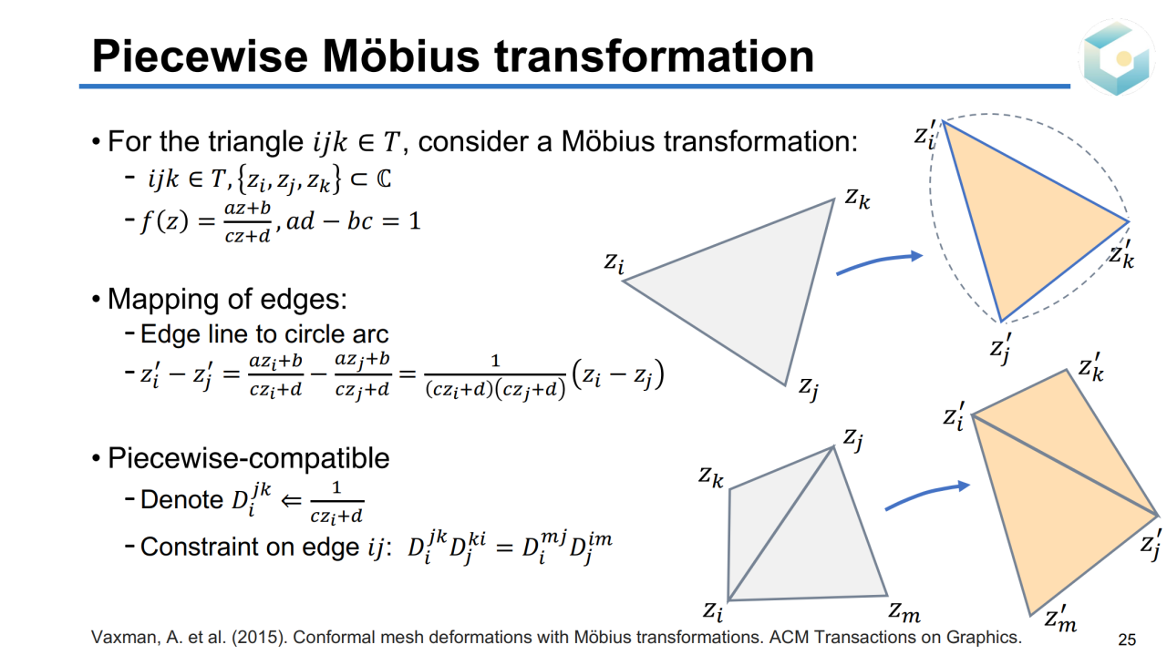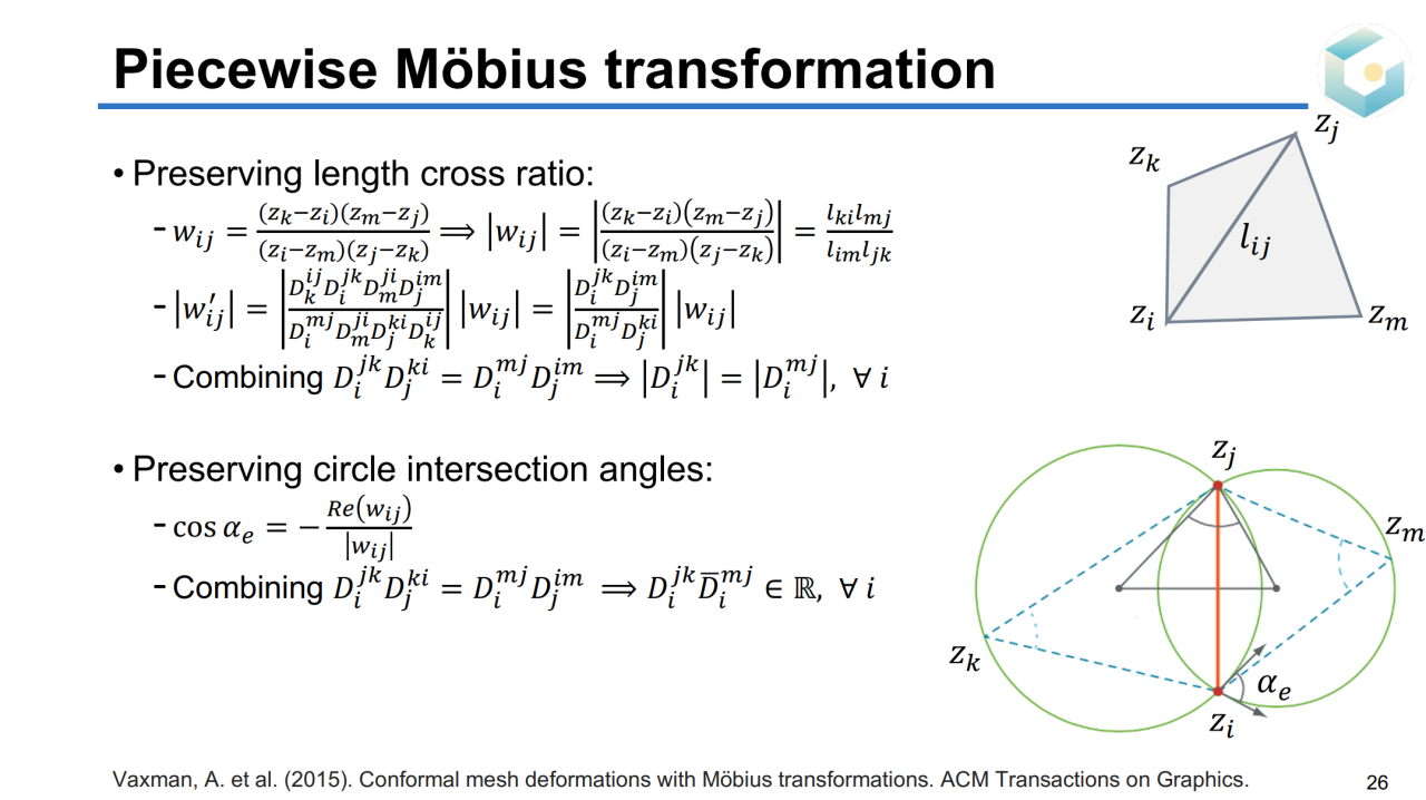 \[\vert w_{ij} \vert = \bigg\vert \frac{(z_k - z_i) (z_m - z_j)}{(z_i - z_m) (z_j - z_k)} \bigg\vert = \frac{l_{ki} \cdot l_{mj}}{l_{im} \cdot l_{jk}}\]结合Möbius变换在公共边上的约束可以得到公共边上顶点\(z_i\)需要满足: