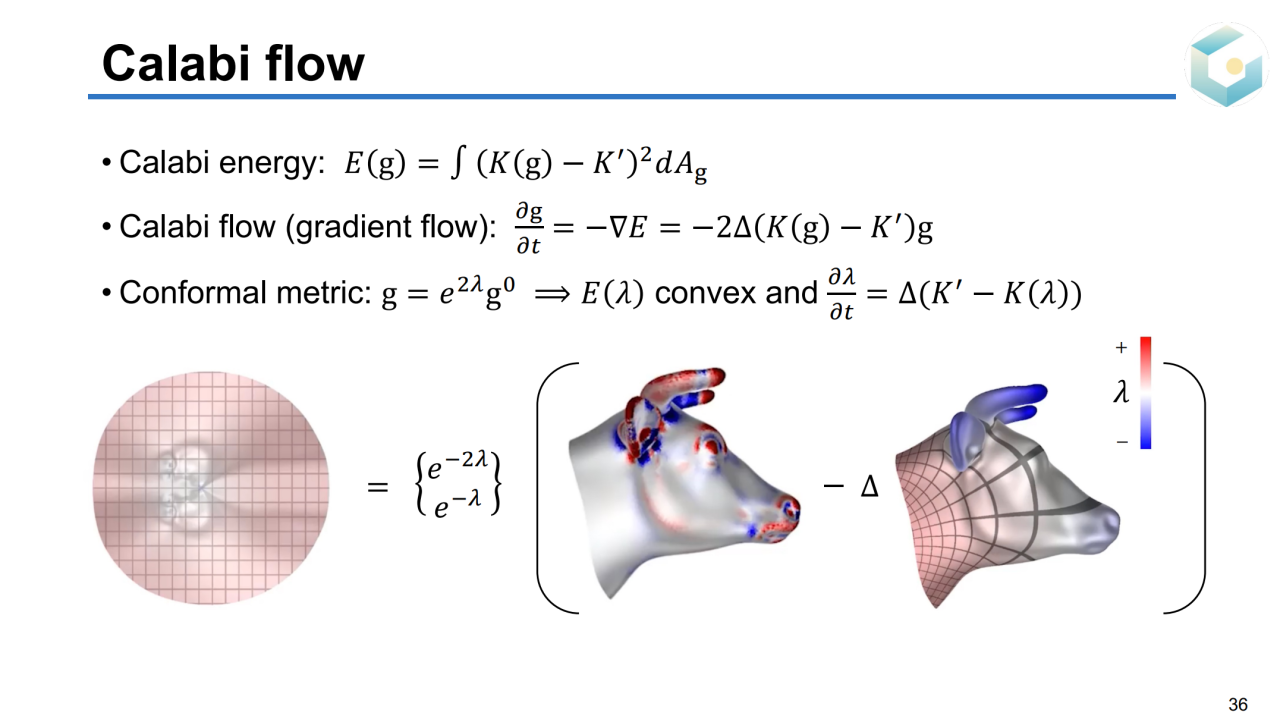 类似于Ricci流,Calabi流(Calabi flow)通过最优化Calabi能量(Calabi energy)来操作曲面的曲率并实现参数化。Calabi流的优点在于它的能量函数相对简单,而且它关于对数共形因子同样也是一个凸函数。