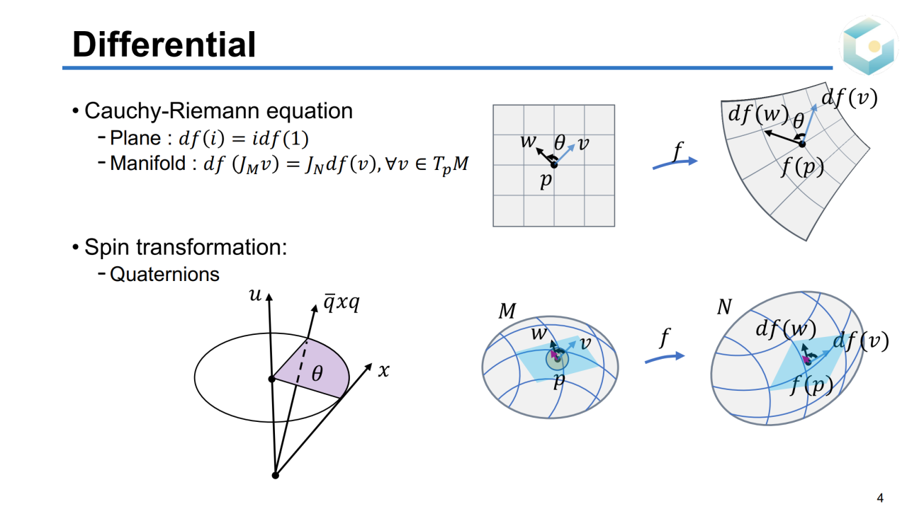 在上一节中我们介绍过共形映射在曲面的局部可以看做旋转和缩放的复合。这样的过程对于平面的情况可以使用复数来进行表示,而在流形上则可以使用四元数来表示。无论哪种情况在进行旋转时需要指定旋转轴,这就要求我们知道曲面切平面和法向,即知道曲面是如何嵌入在空间中的。