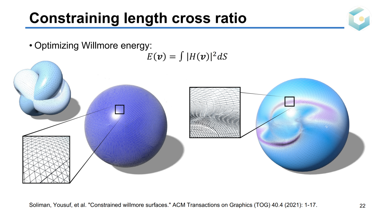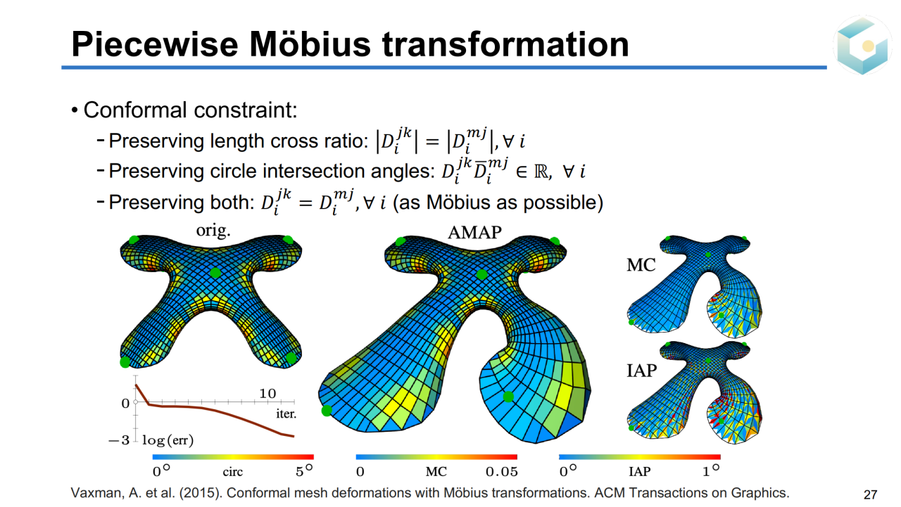 除此之外也可以利用交叉比来计算共形映射。由于边长的交叉比在共形映射下保持不变,我们只需要优化网格上顶点的位置并保证边长交叉比不变就实现了共形映射。