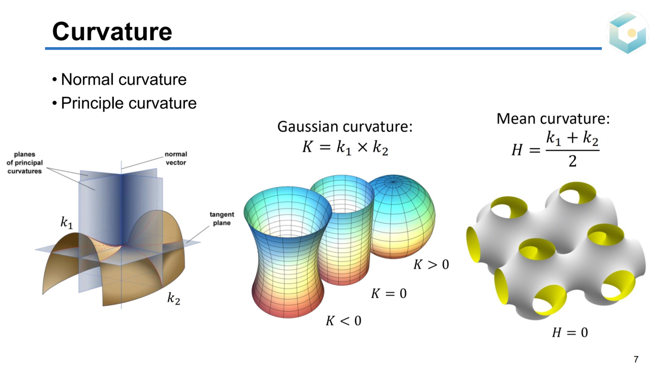 黎曼度量与曲面的曲率也有着深刻的联系。曲面上曲线的曲率在法向上的投影称为法曲率(normal curvature),它衡量了曲面上任意点在给定切向上的弯曲程度。可以证明曲面上任意点的所有方向上存在一对相互垂直的方向使得法曲率分别取最大和最小值,这一对曲率称为曲面的主曲率(principle curvature)。几何处理中最常用的曲率包括高斯曲率(Gaussian curvature)\(K\)以及平均曲率(mean curvature)\(H\)等,其中高斯曲率与Riemann度量都是曲面上的内蕴量与曲面在空间中的嵌入形式无关。