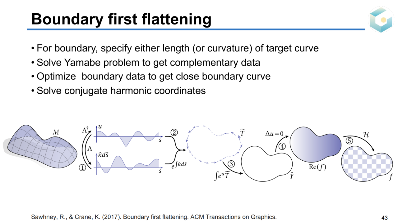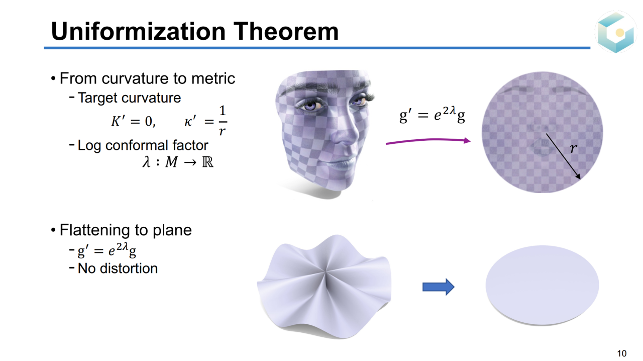 基于单值化定理的参数化算法核心在于计算对数共形因子\(\lambda\)。还是以拓扑同胚于圆盘的曲面为例,只要得到了\(\lambda\)在曲面上的分布就可以无扭曲地将曲面参数化到圆盘上。