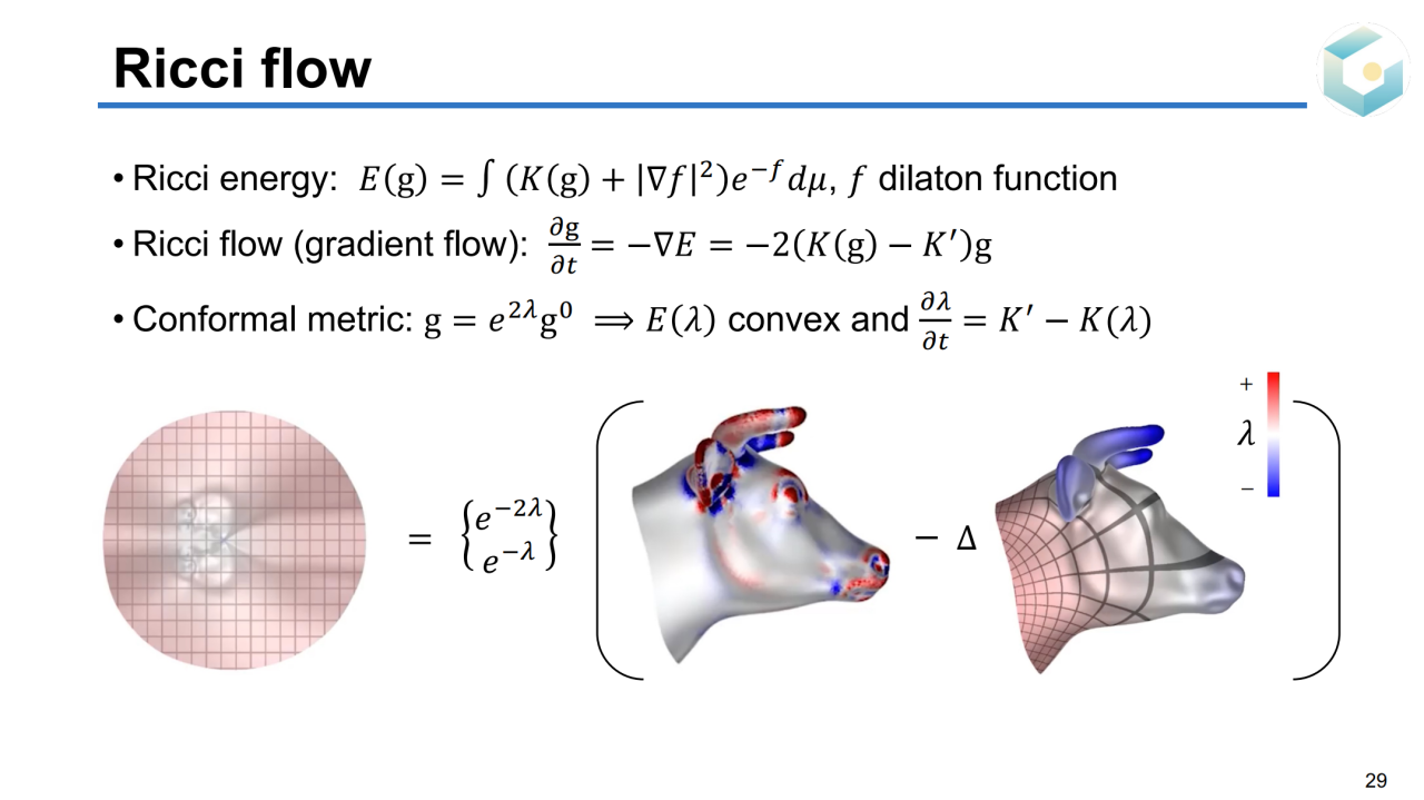 Ricci流(Ricci flow)通过最小化Ricci能量(Ricci energy)来求解Yamabe方程。在共形映射下可以证明Ricci能量关于对数共形因子\(\lambda\)是一个凸函数,且在高斯曲率达到指定值时取全局最小值。