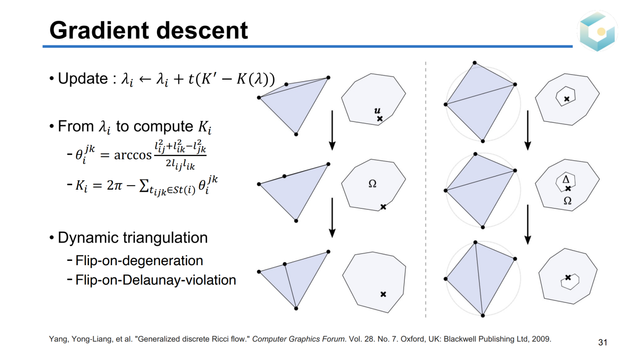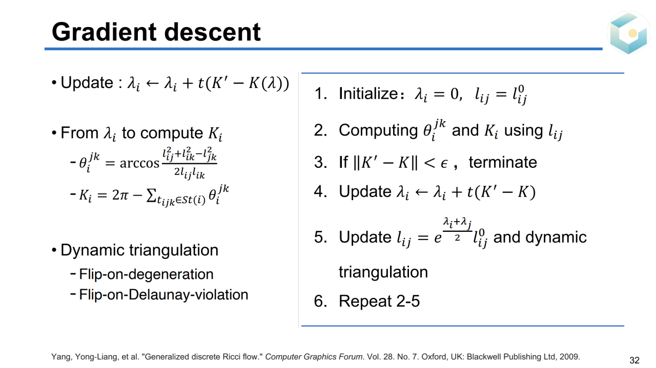 在迭代过程中我们还需要更新顶点上的对数共形因子\(\lambda_i\)。通过一些变形可以把边长以及对数共形因子都表示为角度的函数,这样只需要更新每个三角形上的角度即可。当然在迭代过程中也可能会出现三角形退化的情况,此时可以使用dynamic triangulation的技术来进行处理。