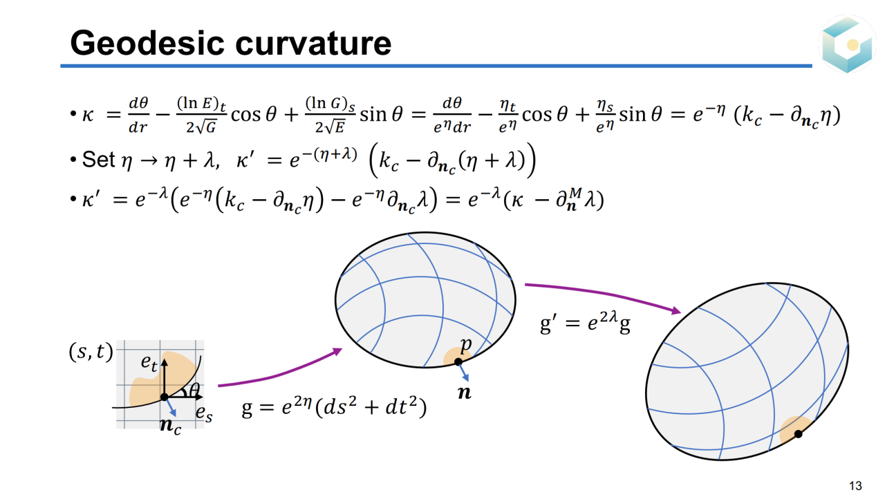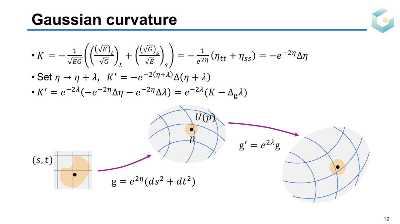 \[K = -e^{-2 \eta} \cdot \Delta \eta\]在共形映射下,新的曲面上Riemann度量只与原曲面相差一个对数共形因子\(\lambda\),此时新的曲面上高斯曲率满足: