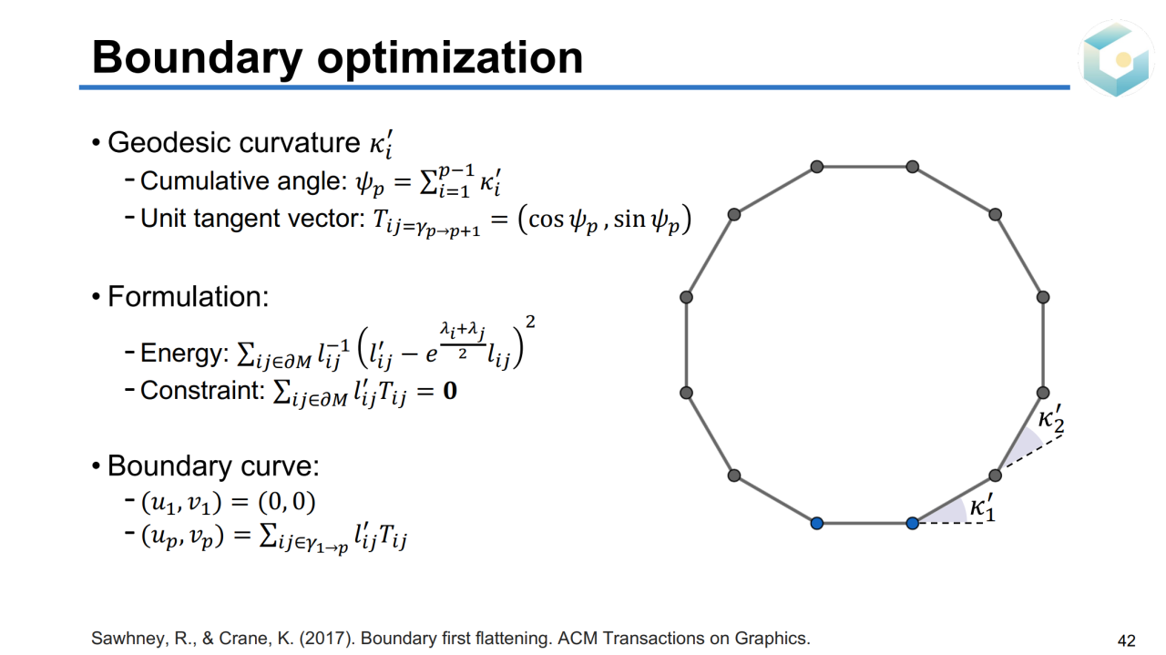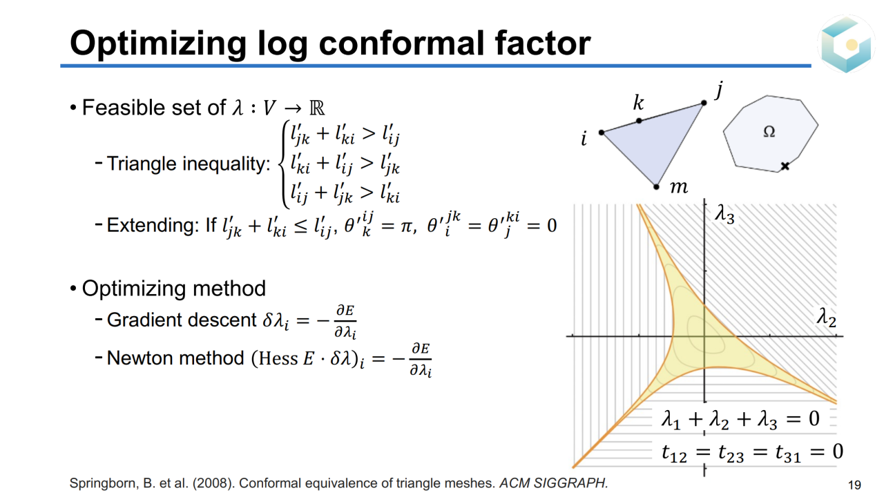 三角形的边长和角度需要满足余弦定理。同时考虑网格内部顶点的内角和为\(2 \pi\),边界顶点上的内角和满足相应的约束。这样优化共形因子就转换为了对三角形角度的优化。