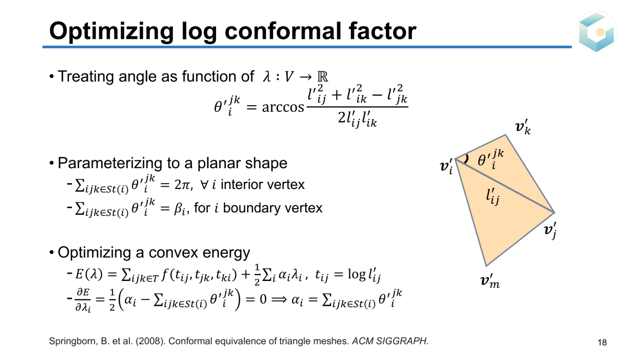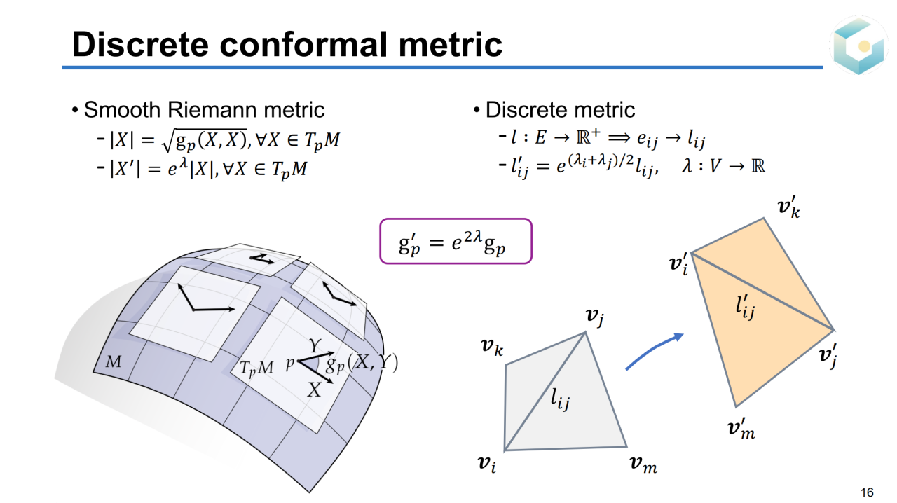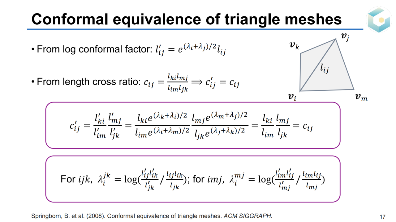 \[c_{ij} = \frac{l_{ki} \cdot l_{mj}}{l_{im} \cdot l_{jk}} = \frac{l_{ki} \cdot e^{\frac{\lambda_k + \lambda_i}{2}}}{l_{jk} \cdot e^{\frac{\lambda_j + \lambda_k}{2}}} \cdot \frac{l_{mj} \cdot e^{\frac{\lambda_m + \lambda_j}{2}}}{l_{jk} \cdot e^{\frac{\lambda_j + \lambda_k}{2}}} = \frac{l_{ki}' \cdot l_{mj}'}{l_{im}' \cdot l_{jk}'} = c_{ij}'\]此时对于顶点\(v_i\)在三角形\(\Delta_{ijk}\)上对边\(e_{jk}\)所定义的对数共形因子为: