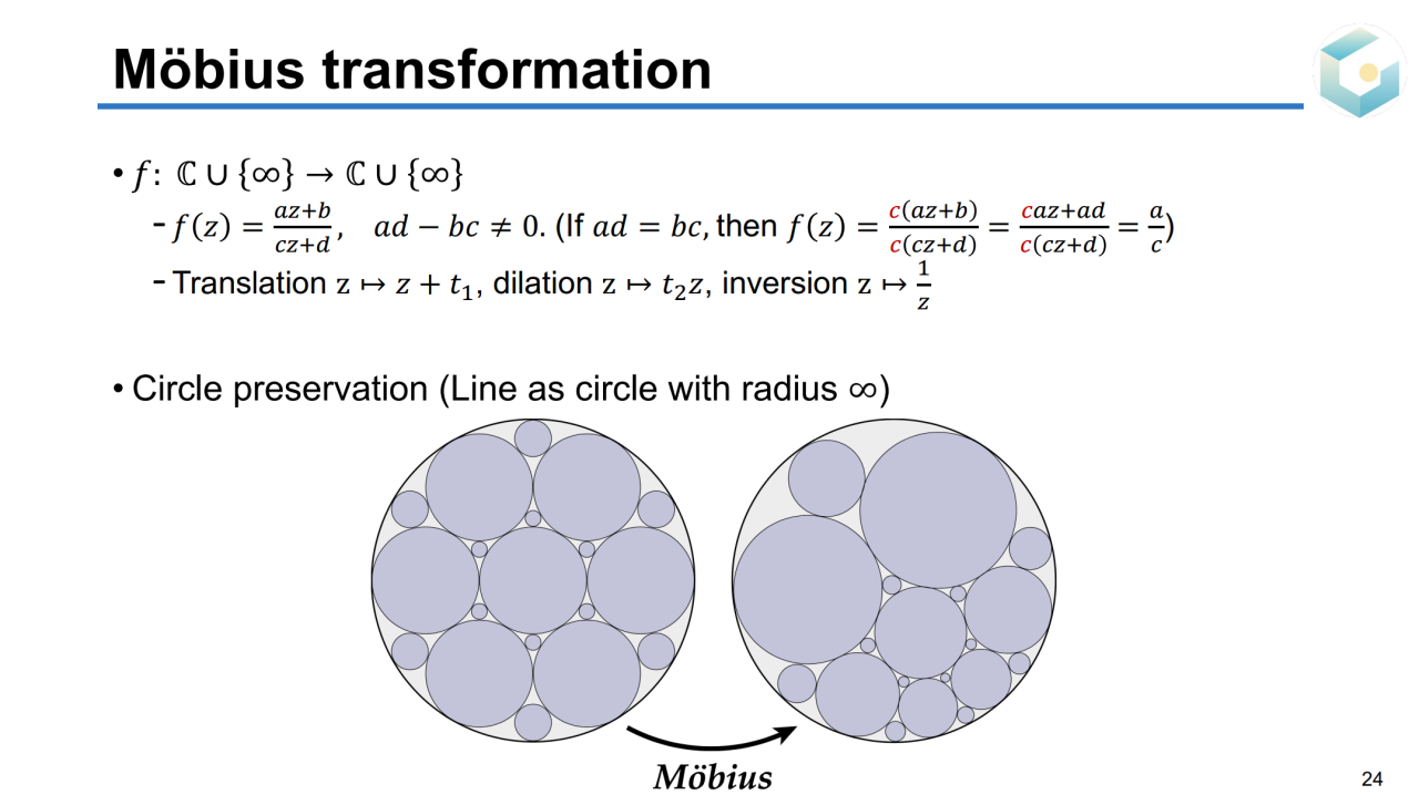 \[f(z) = \frac{az + b}{cz + d}\]其中参数\(a, b, c, d\)为满足\(ad - bc \neq 0\)的复数。Möbius变换\(f(z)\)的一个性质在于它可以分解为平移(translation)、伸缩(dilation)以及反演(inversion)的复合,这保证了Möbius变换可以将复平面上的圆映射为另一个圆。