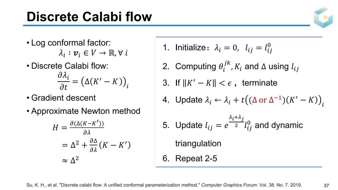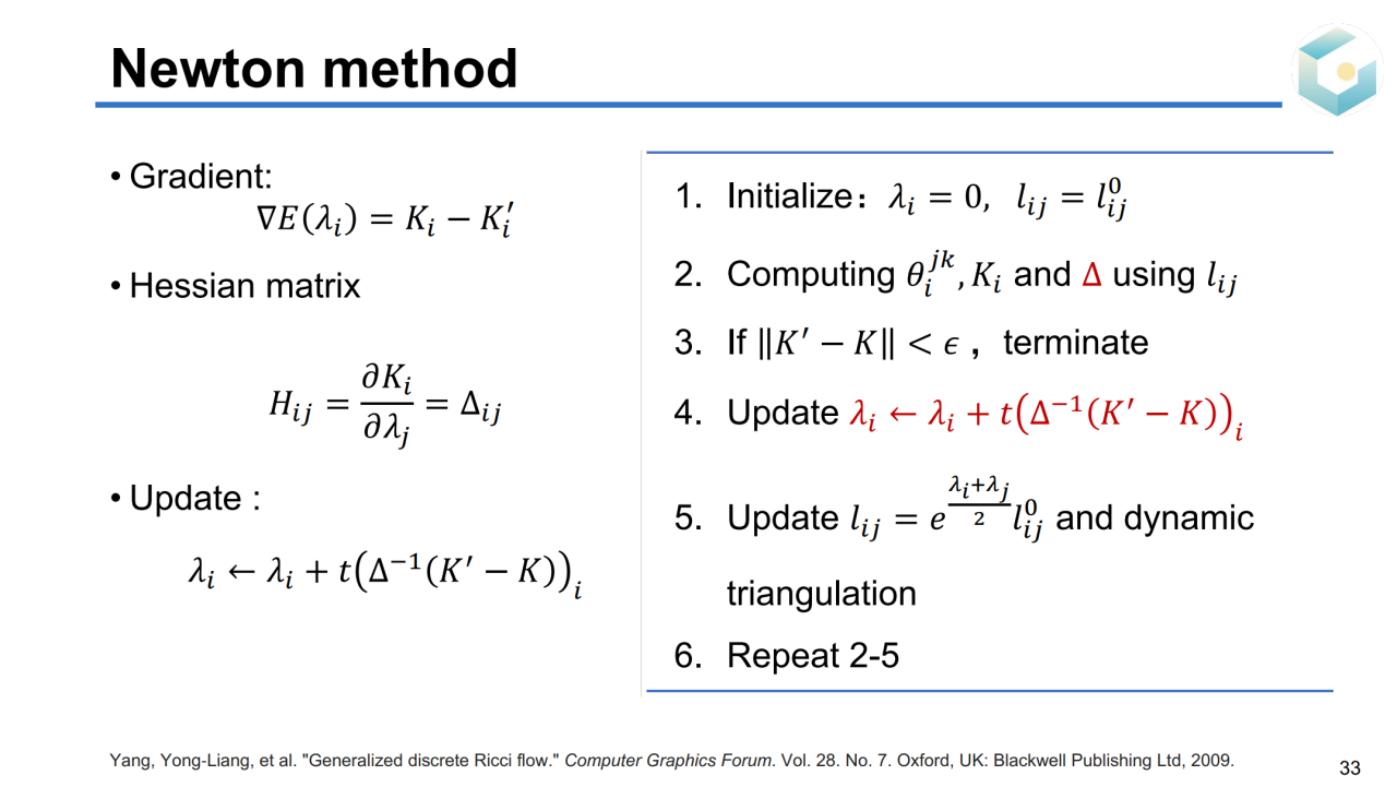 整个离散Ricci流可以使用一阶的梯度下降或是二阶的牛顿法来进行计算。