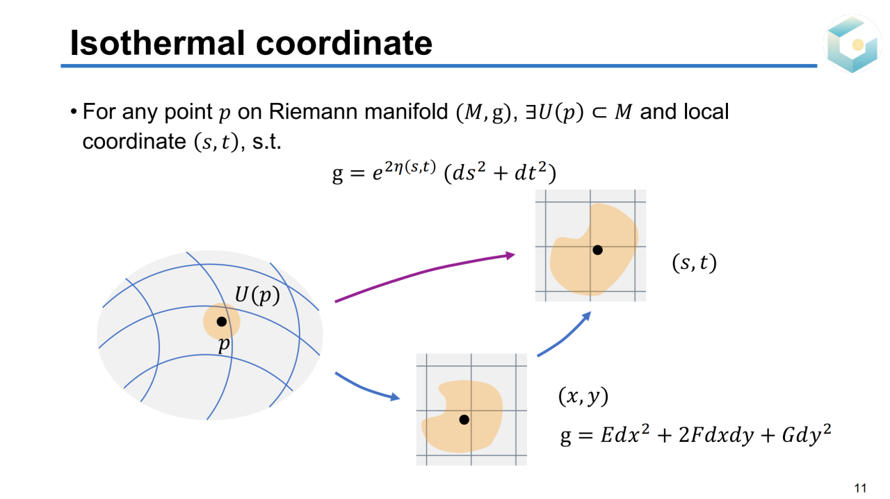 要计算对数共形因子则需要考察高斯曲率在共形映射前后的关系。这里我们引入局部等温坐标(isothermal coordinate)的概念,对于流形上点\(p\)处的一个邻域一定存在坐标变换使得其Riemann度量满足: