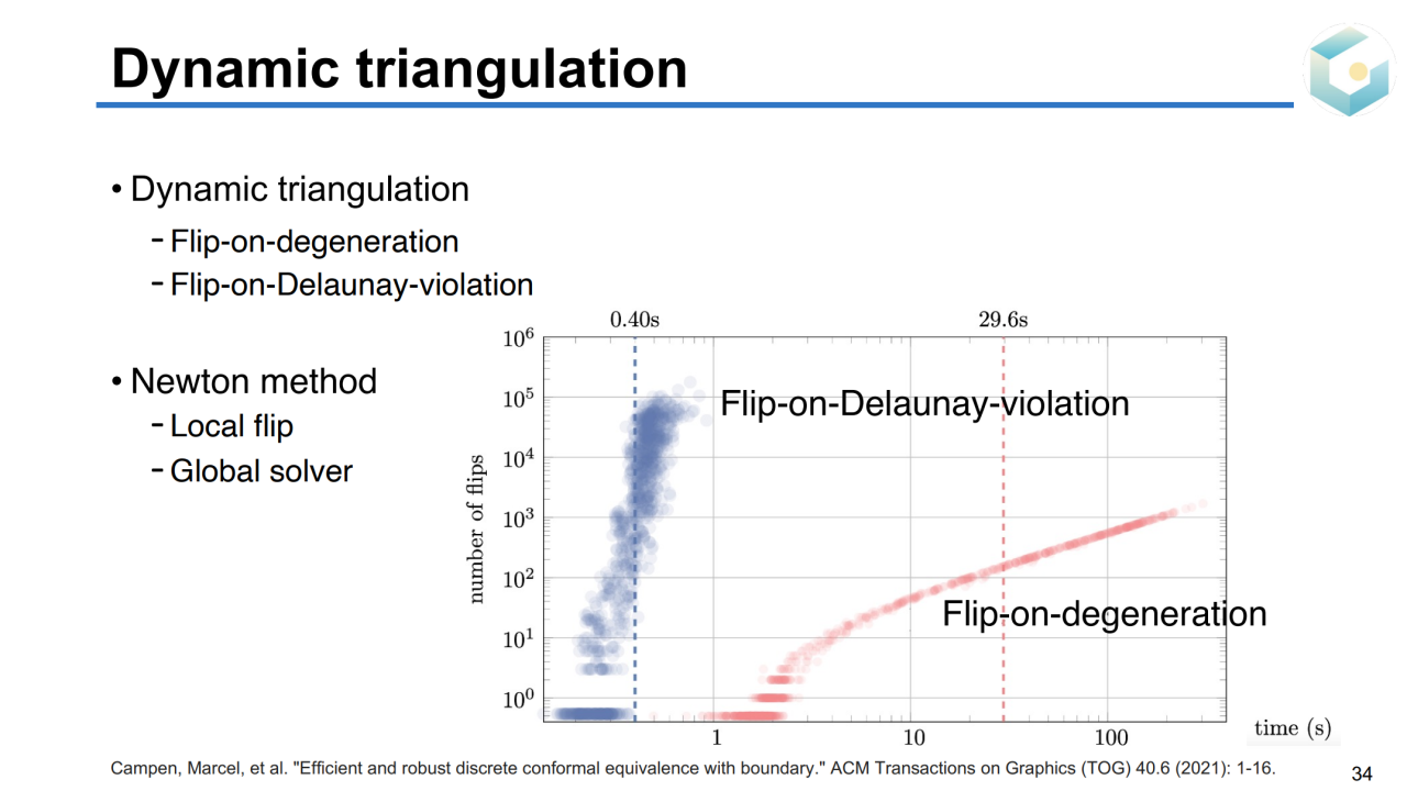 dynamic triangulation有两种实现方式,一种是在接近退化时进行翻转,而另一种则是在违背Delaunay三角化时进行翻转。试验结果表明第二种实现方式往往具有更高的计算效率。