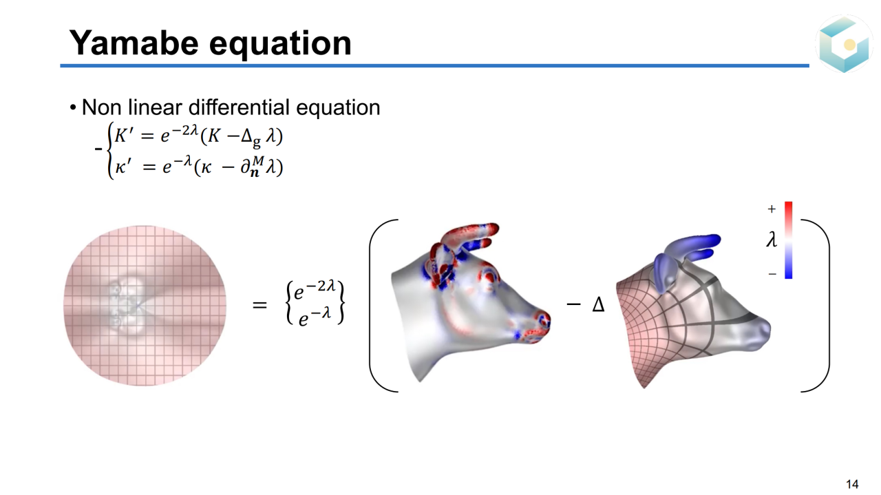把上面两种情况结合起来就得到了曲率在共形映射下需要满足的偏微分方程,即Yamabe方程(Yamabe equation)。在求解参数化时只需要分别指定圆盘内部以及边界上的曲率然后通过曲率流进行迭代即可。