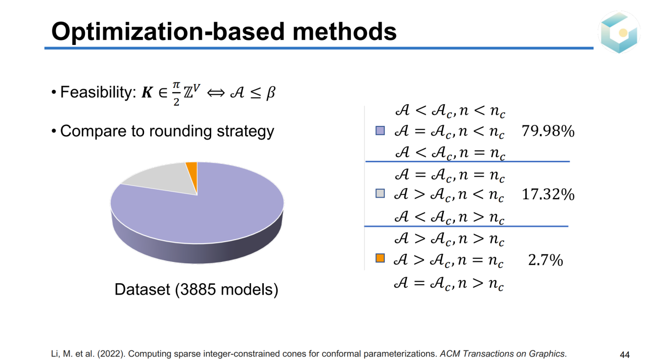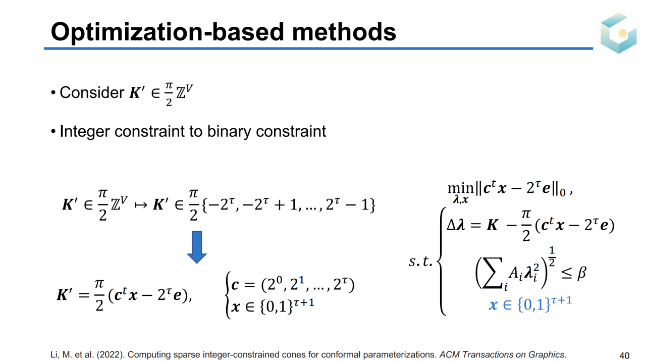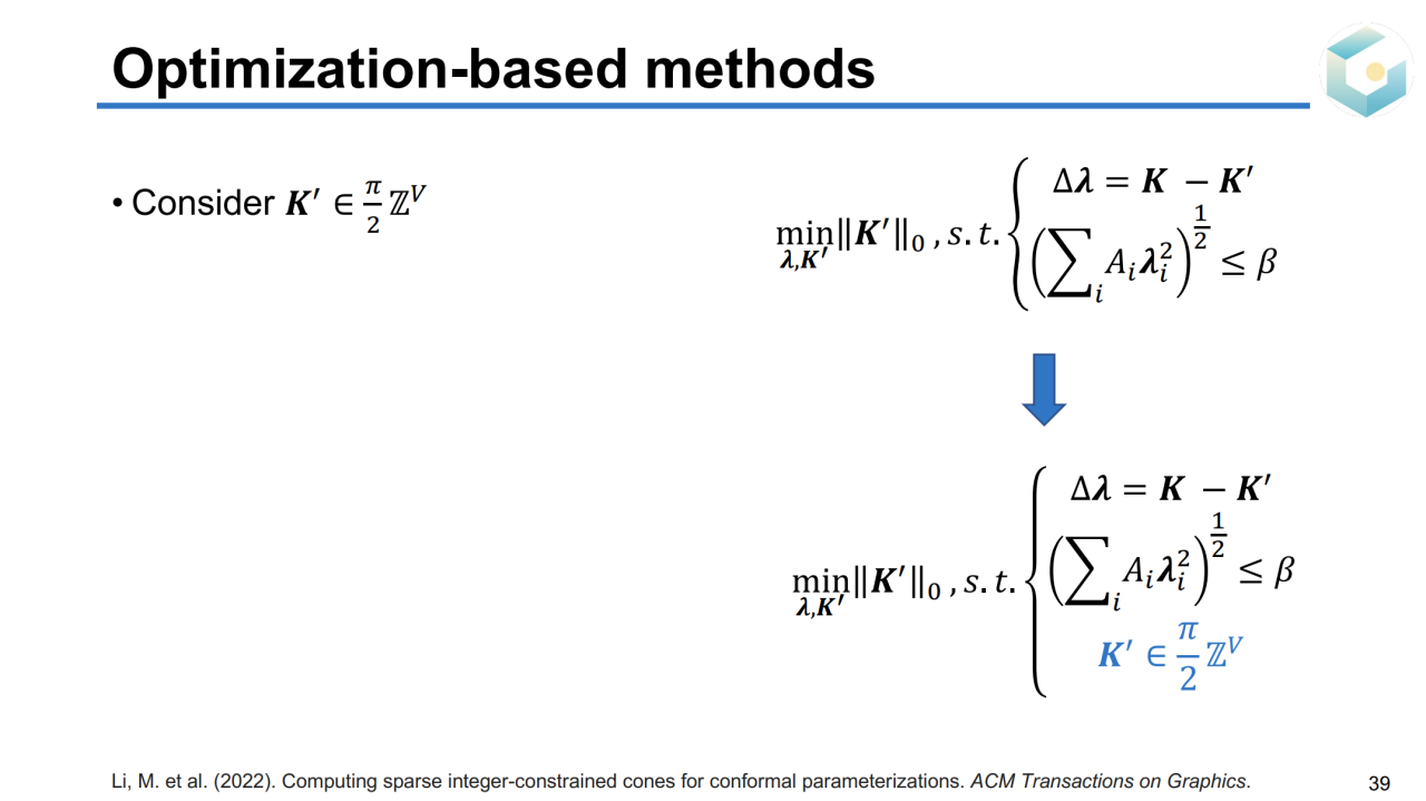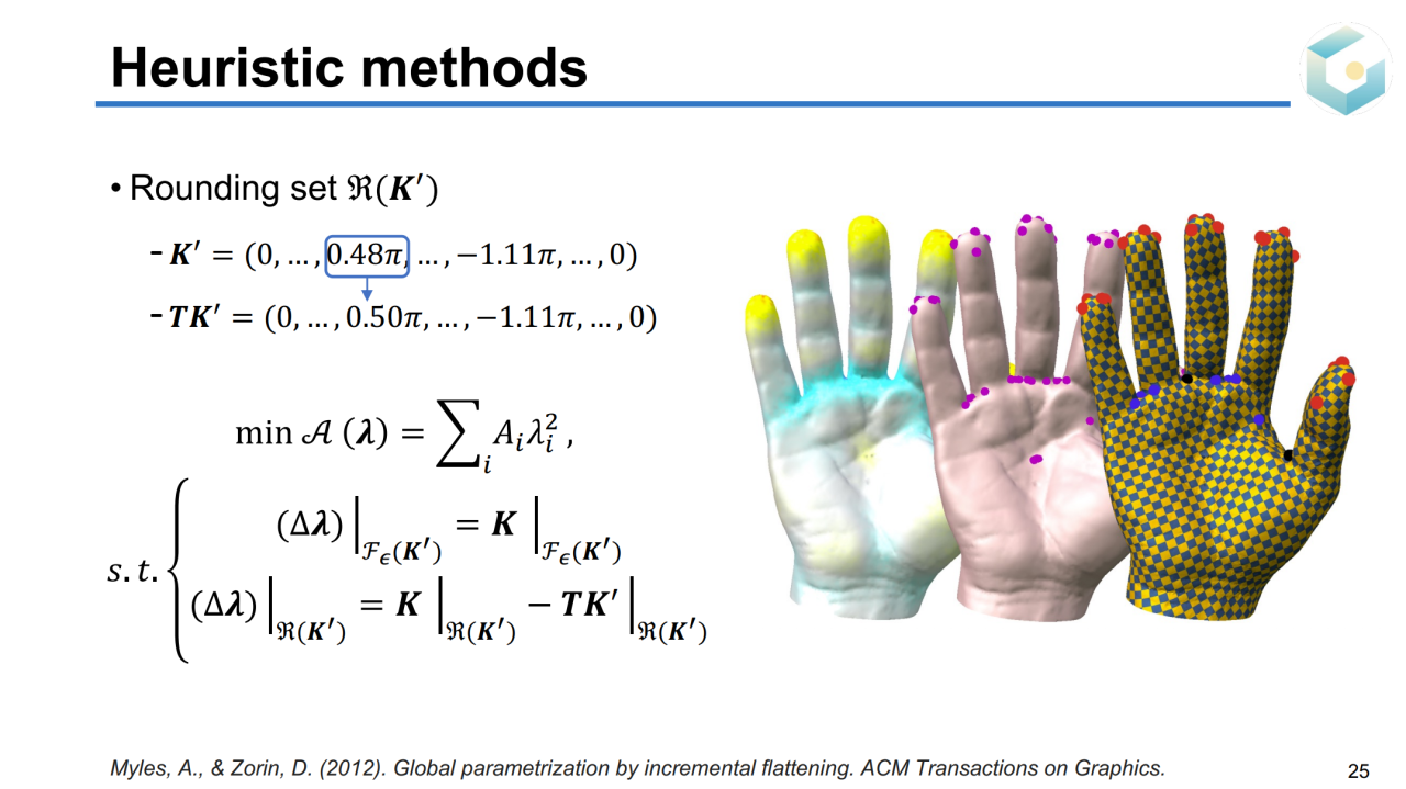 如果要约束映射后锥奇异点上的高斯曲率为\(\frac{\pi}{2}\)的整数倍,可以对奇异点上的高斯曲率按照\(\frac{\pi}{2}\)进行取整。需要注意的是Gauss–Bonnet定理对高斯曲率在整个曲面上的积分存在约束,因此只能每次选择曲率最接近\(\frac{\pi}{2}\)整数倍的顶点进行取整,并且要求取整后高斯曲率的和不变。