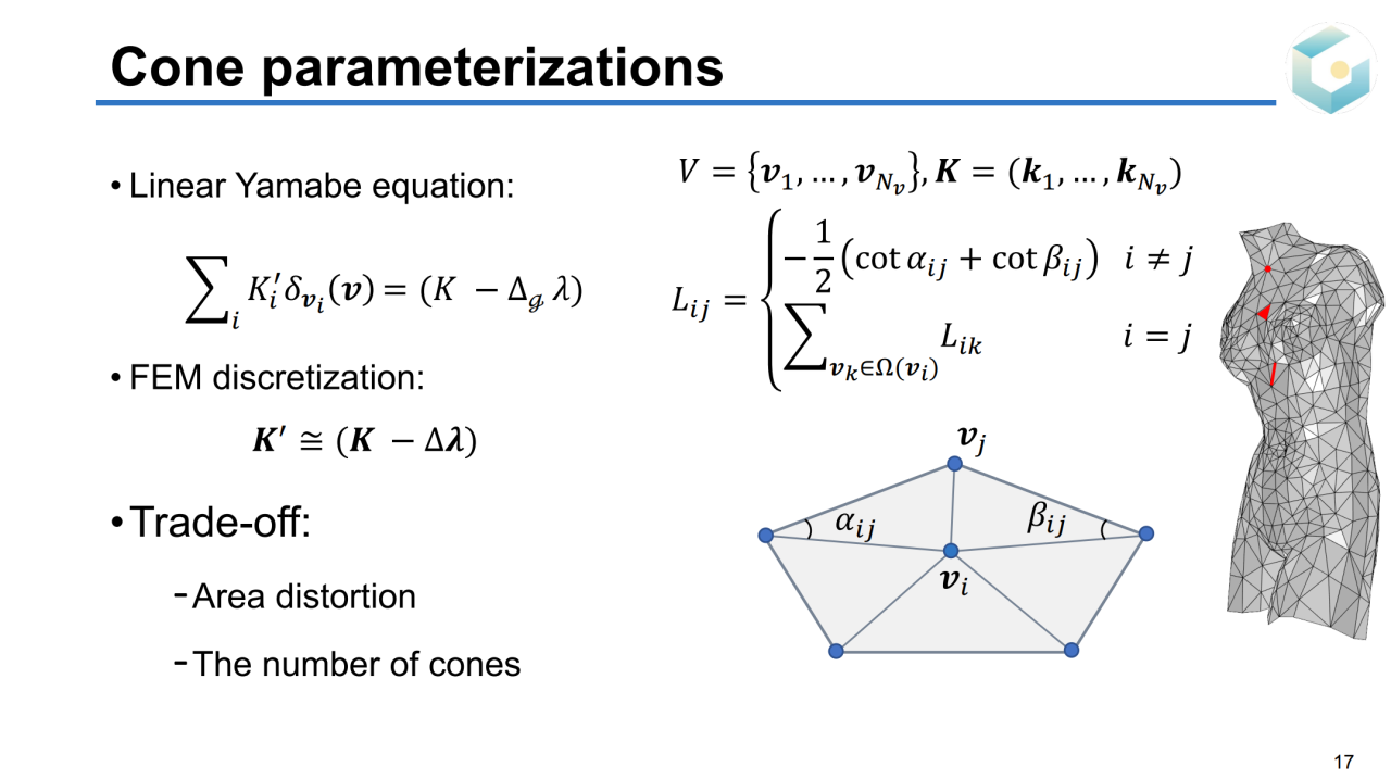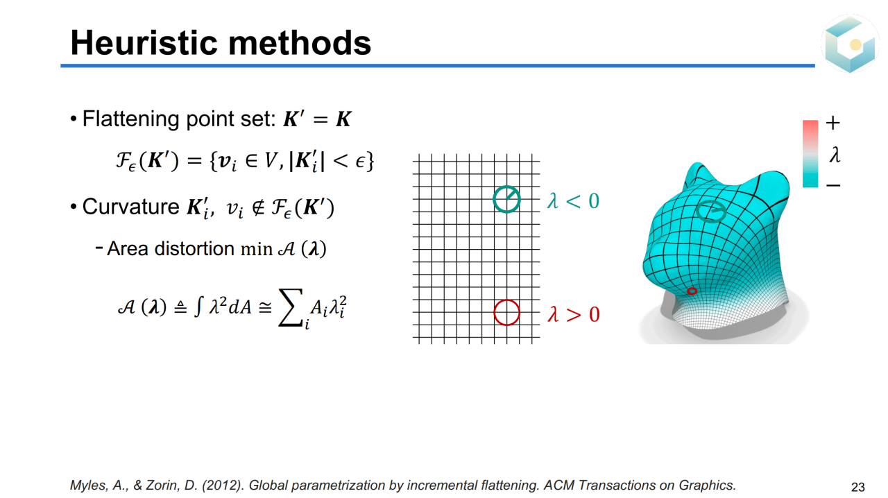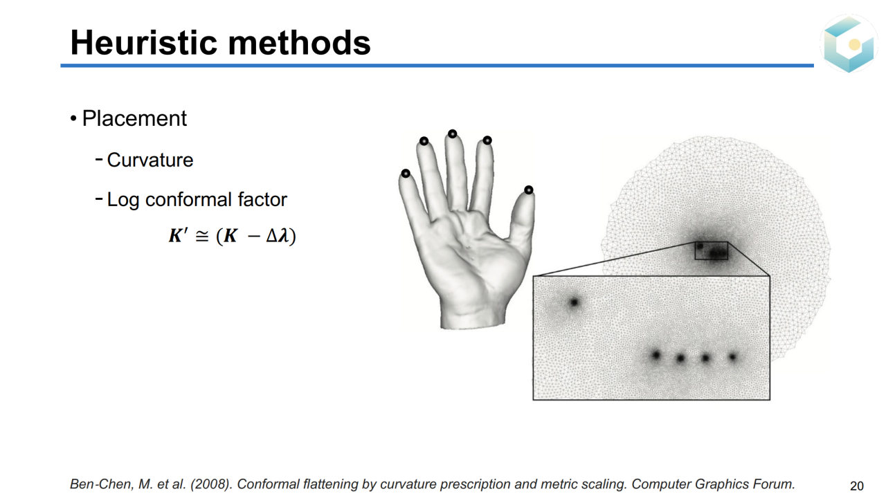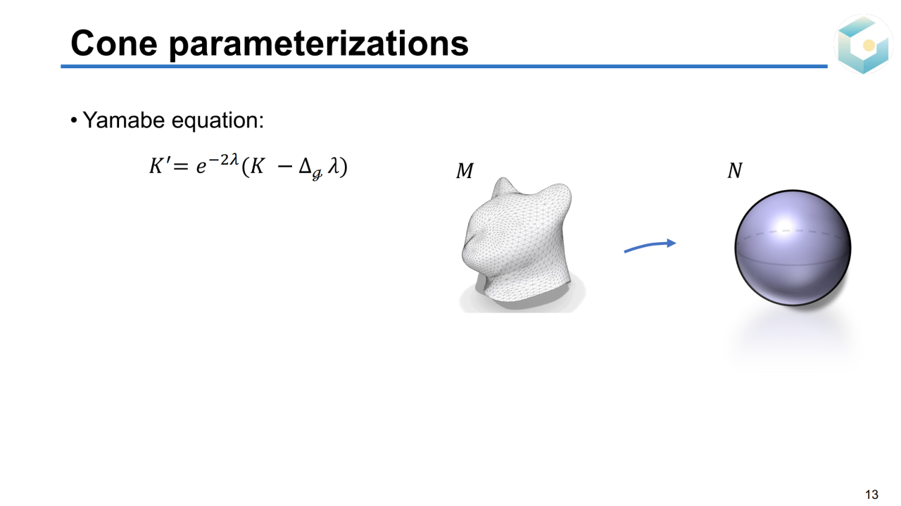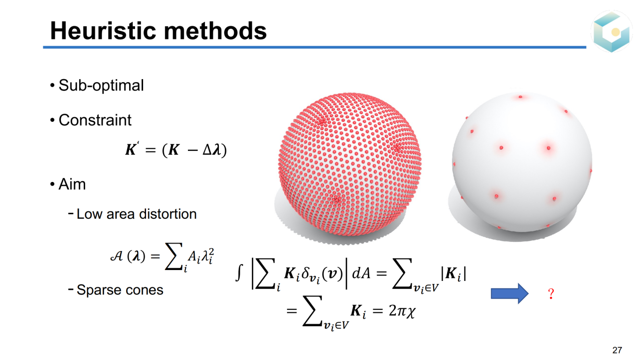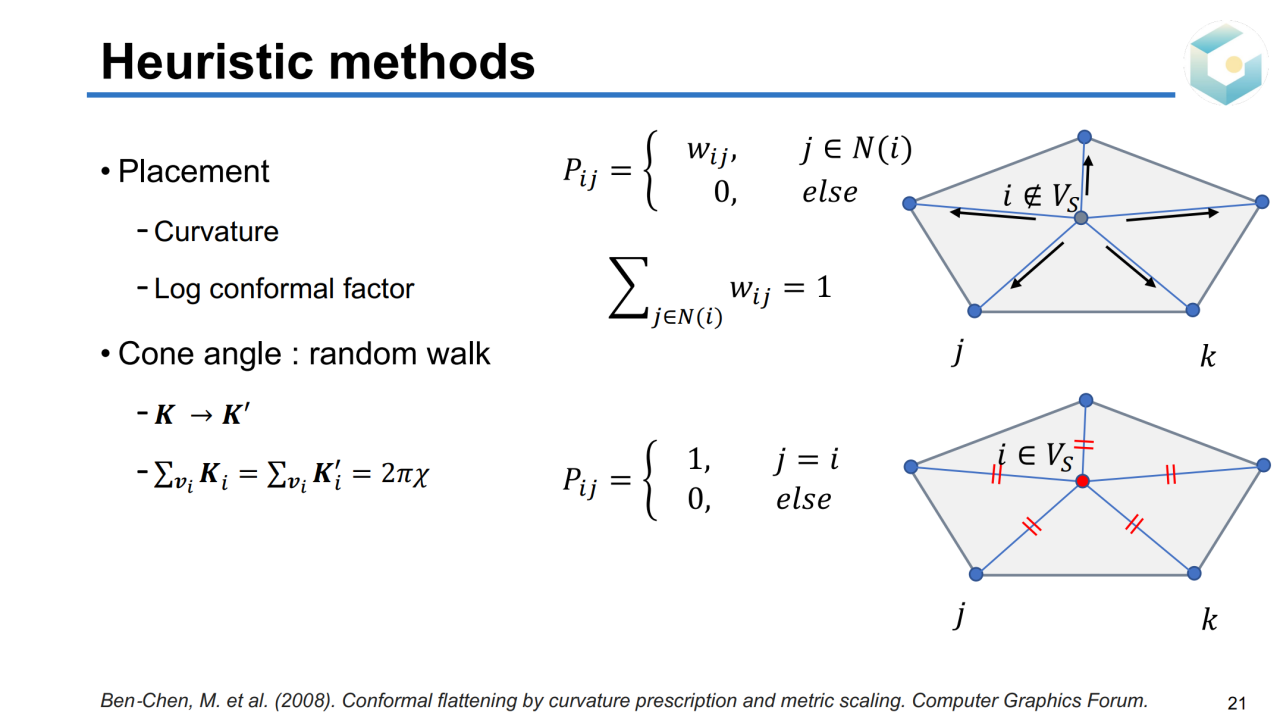 另一种启发式算法是先假定曲面上没有锥奇异点,直接对网格进行共形参数化。然后利用参数化前后高斯曲率与对数共形因子的约束来计算对数共形因子\(\lambda\)在网格上的分布,并选择\(\lambda\)的极值点作为锥奇异点。