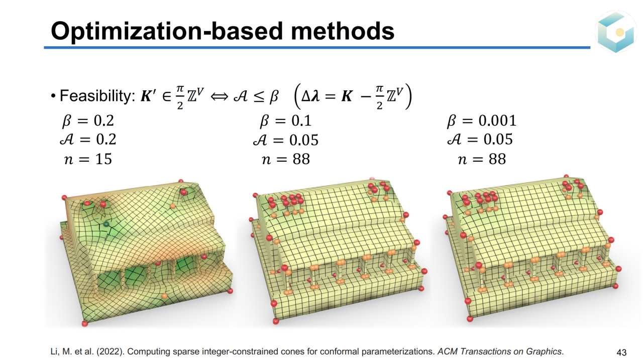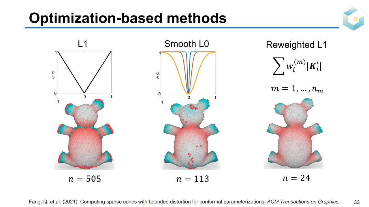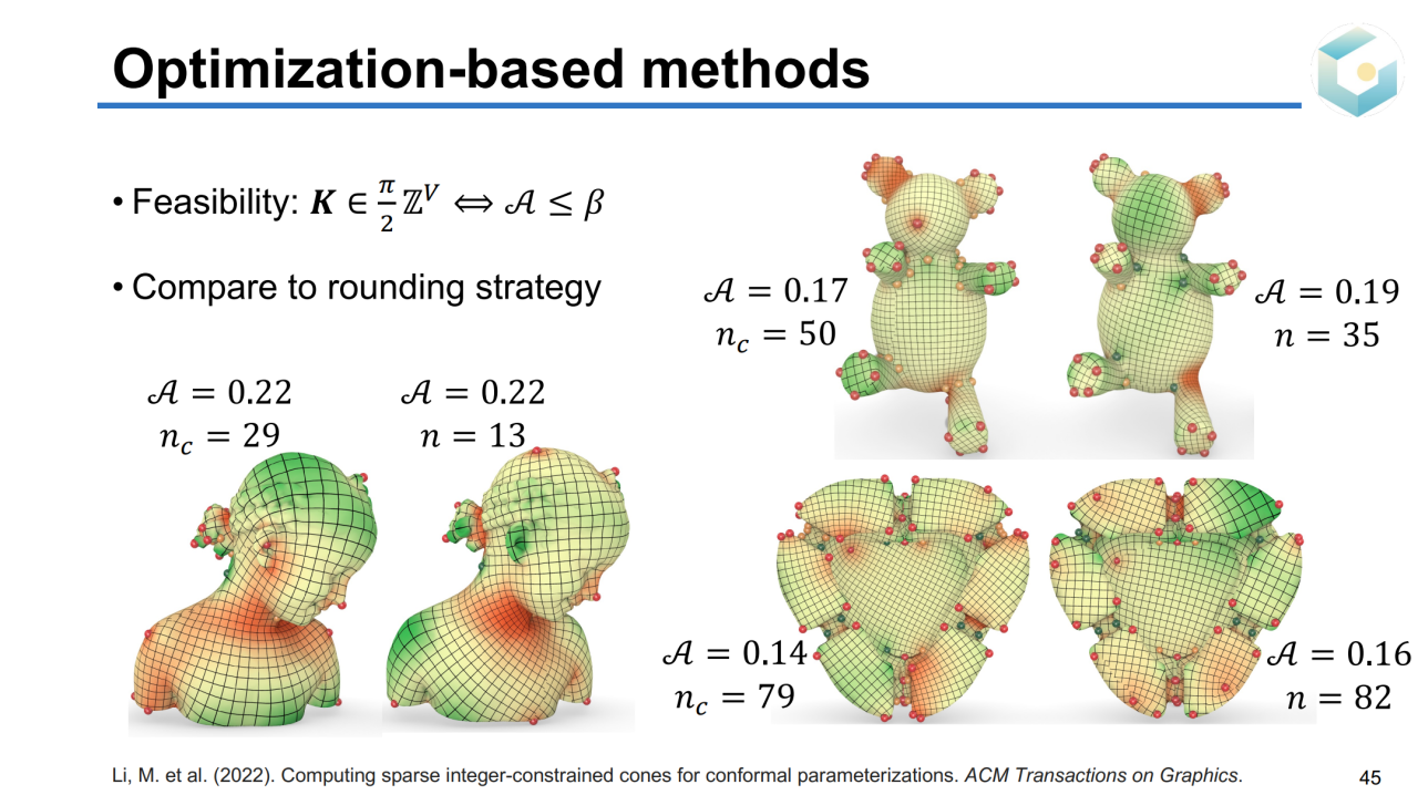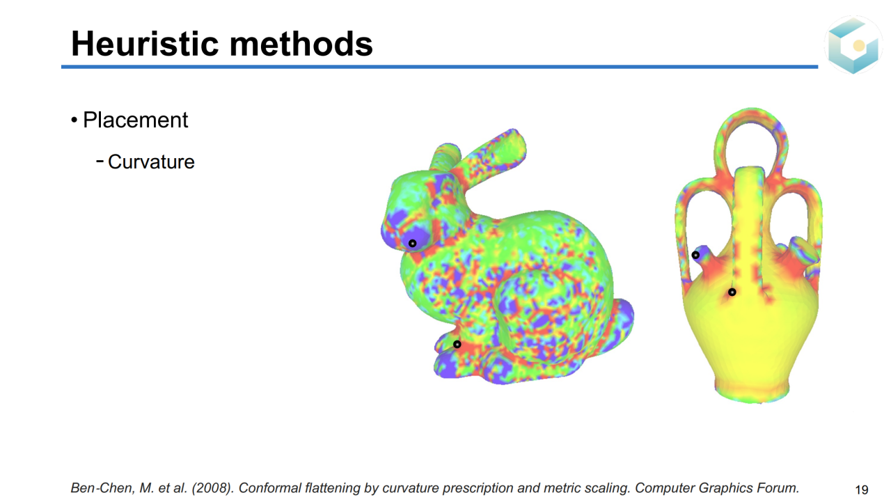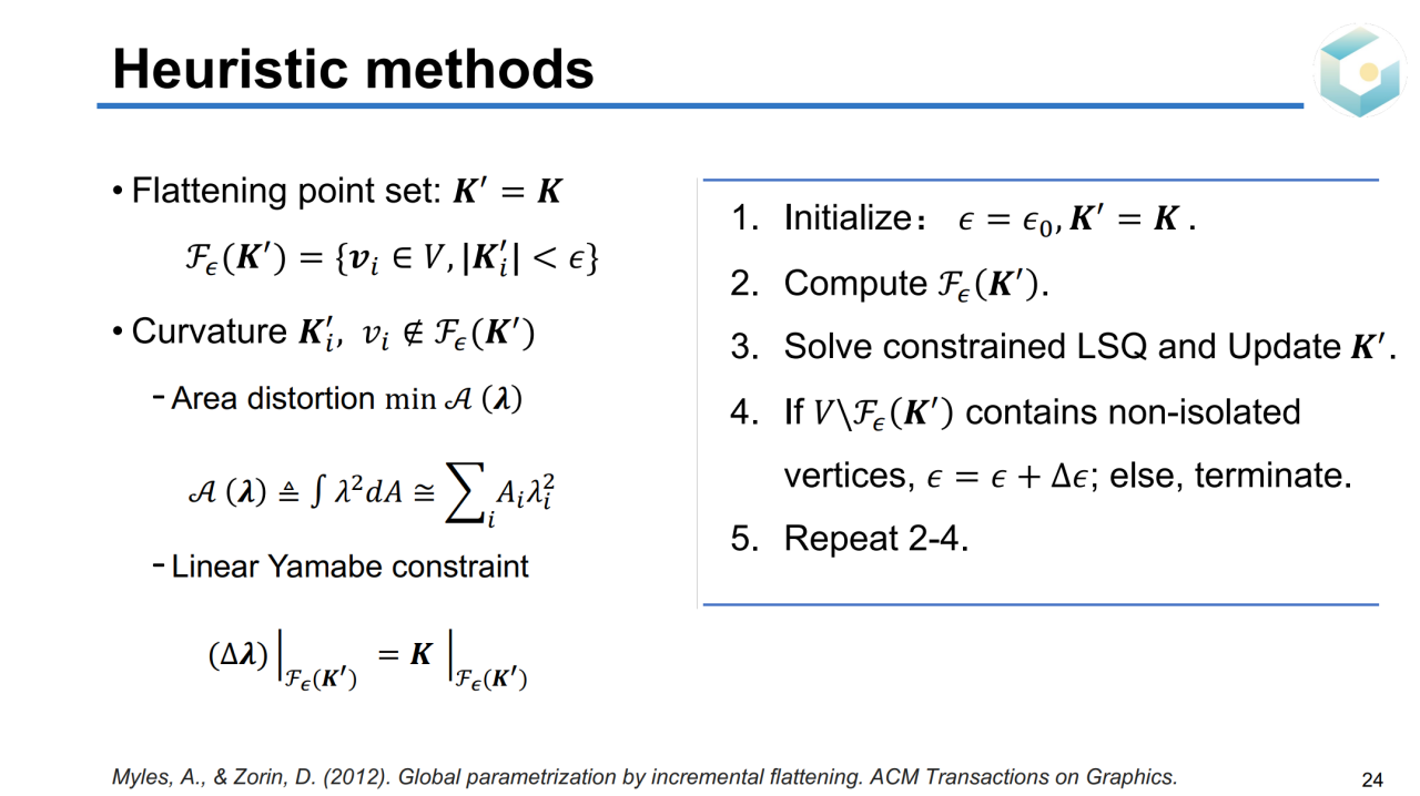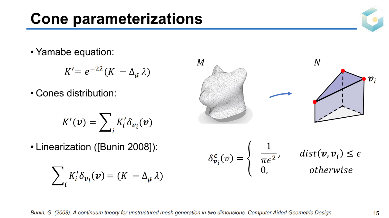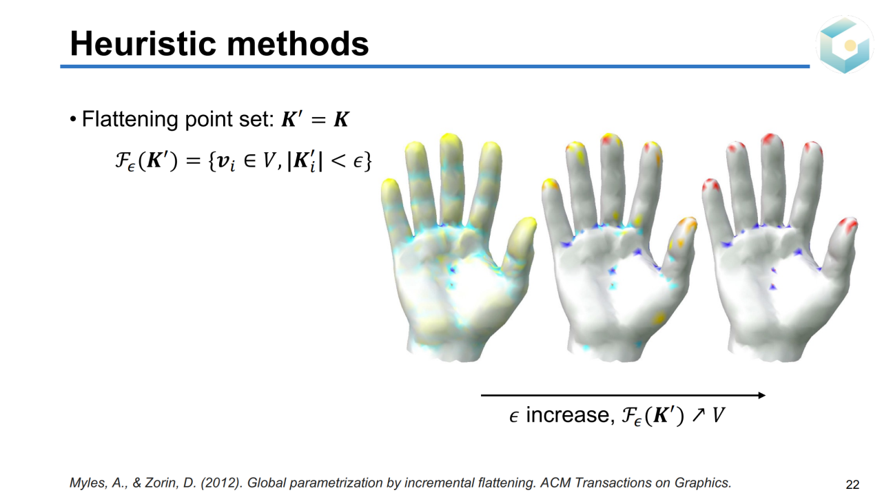 另一种启发式算法是先假定曲面上没有锥奇异点,直接对网格进行共形参数化。然后利用参数化前后高斯曲率与对数共形因子的约束来计算对数共形因子\(\lambda\)在网格上的分布,并选择\(\lambda\)的极值点作为锥奇异点。
