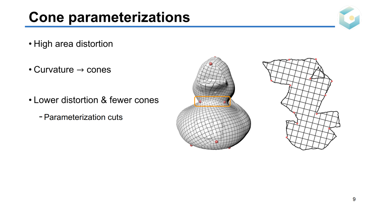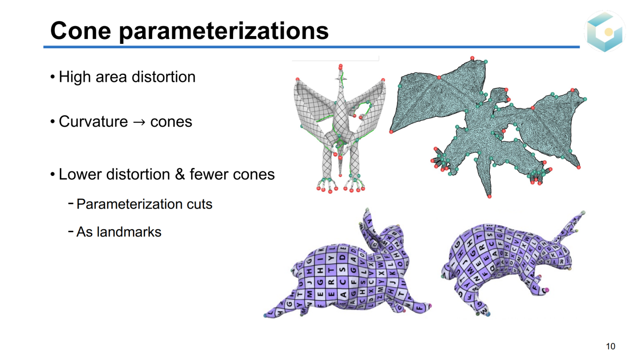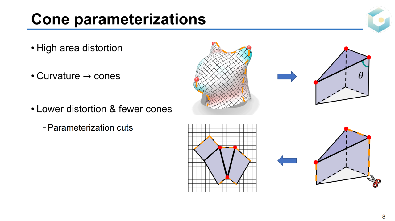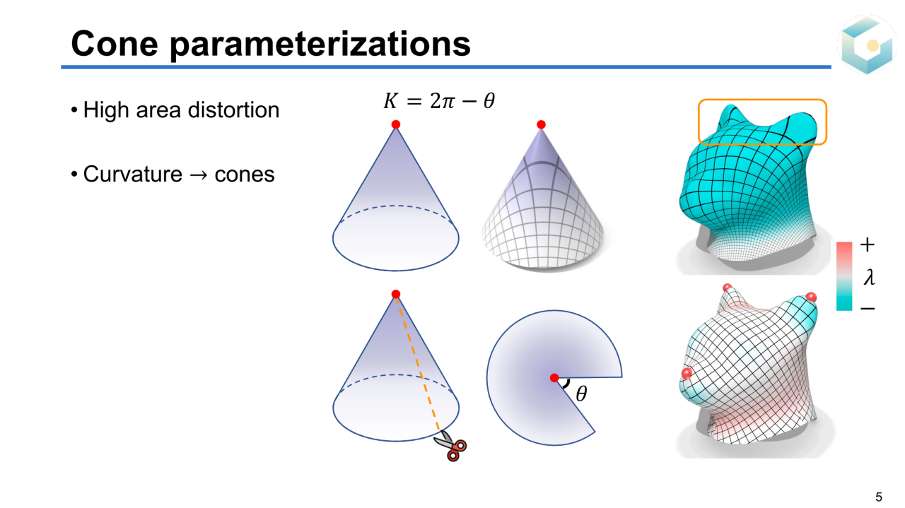 为了解决这样的问题人们提出了锥奇异点参数化(cone parameterization)的技术,通过在网格上放置一些奇异点来控制整体的面积扭曲。最直观的一个例子是对圆锥面进行参数化:圆锥面的锥点是一个奇异点,而在表面的其它位置上高斯曲率为0。直接对锥面进行参数化会在锥点上产生巨大的几何扭曲,但如果从锥点将曲面剪开我们则可以实现无扭曲的参数化。因此锥奇异点参数化的思想在于允许曲面上一些点的高斯曲率不为0,而在远离这些奇异点的区域则有为0的高斯曲率。这样就可以避免过大的几何(面积)扭曲。
