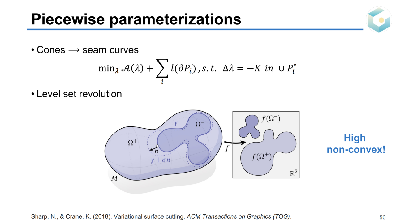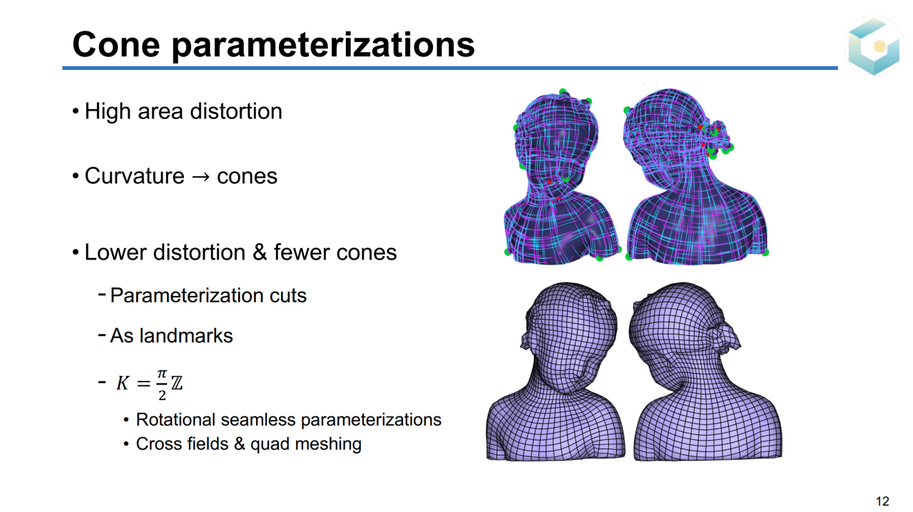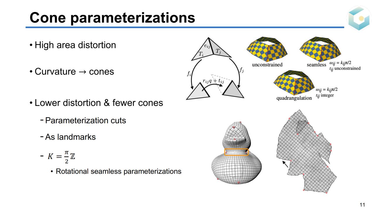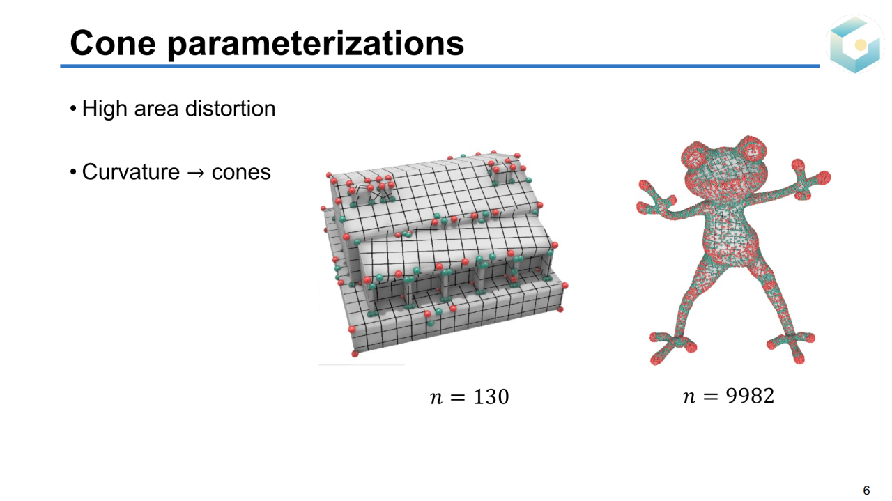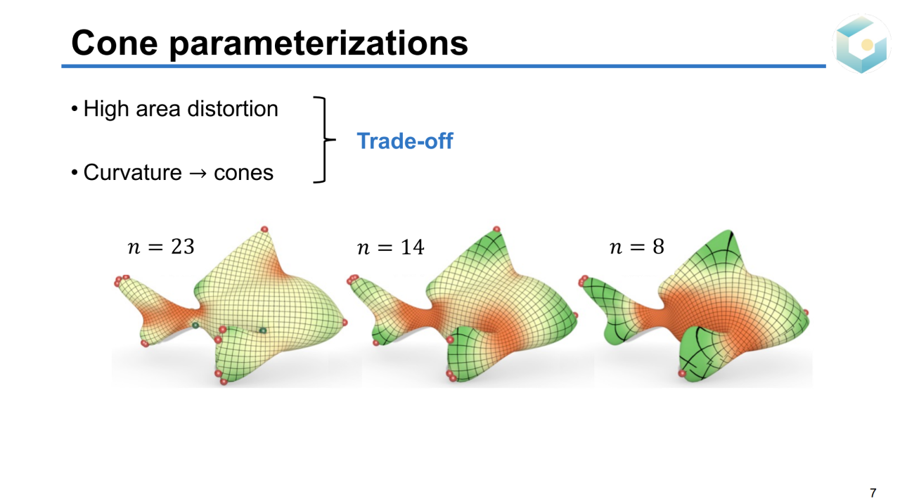 为了解决这样的问题人们提出了锥奇异点参数化(cone parameterization)的技术,通过在网格上放置一些奇异点来控制整体的面积扭曲。最直观的一个例子是对圆锥面进行参数化:圆锥面的锥点是一个奇异点,而在表面的其它位置上高斯曲率为0。直接对锥面进行参数化会在锥点上产生巨大的几何扭曲,但如果从锥点将曲面剪开我们则可以实现无扭曲的参数化。因此锥奇异点参数化的思想在于允许曲面上一些点的高斯曲率不为0,而在远离这些奇异点的区域则有为0的高斯曲率。这样就可以避免过大的几何(面积)扭曲。