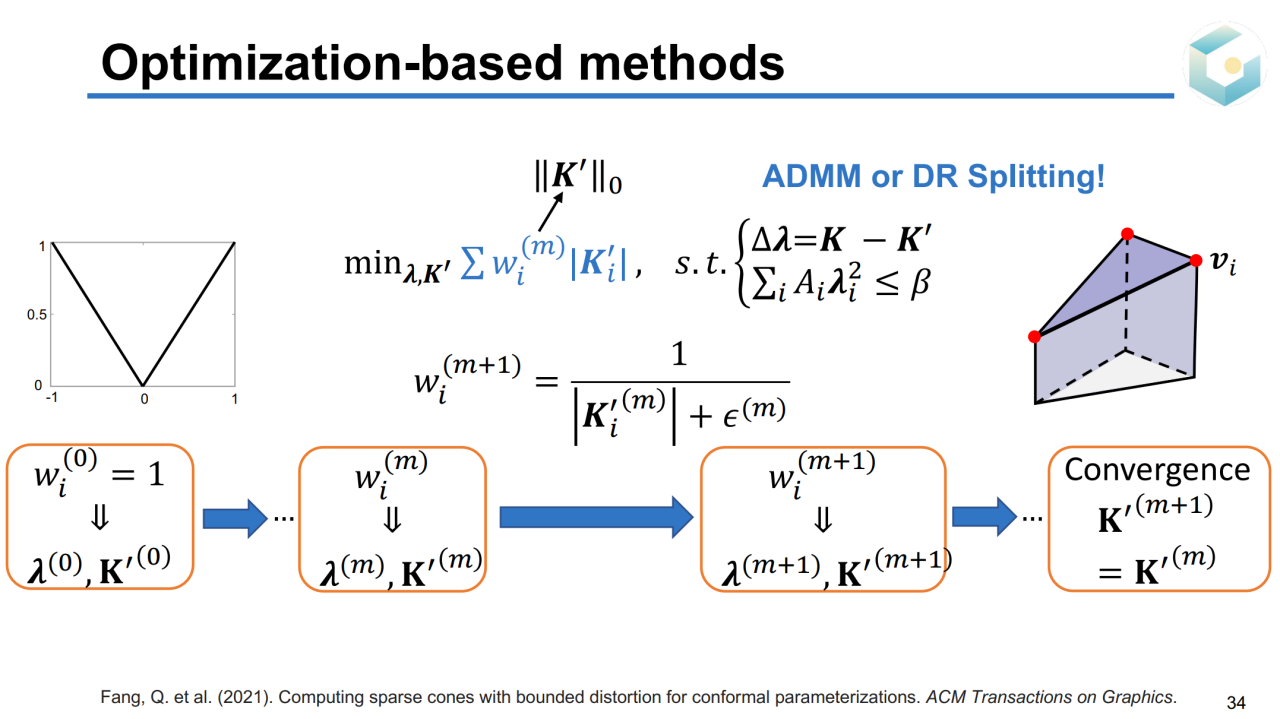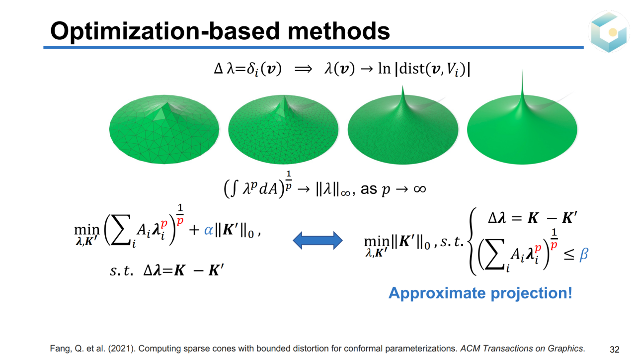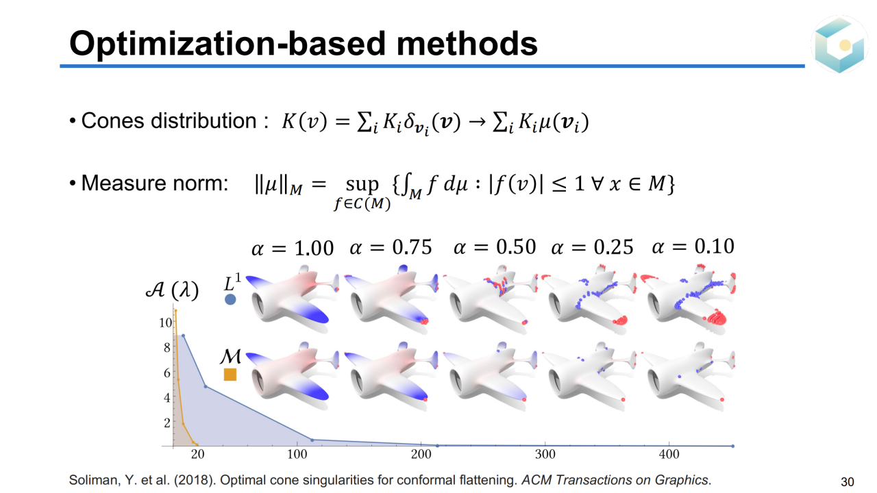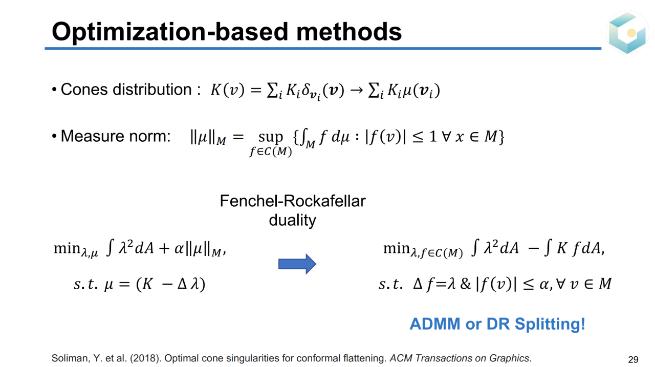 我们希望锥奇异点的数量不要太多,因此优化方法的难点在于如何获得一个稀疏的解。由于锥奇异点的分布可以表示为dirac函数的线性组合,利用函数与测度空间的对偶性可以把原始问题转换到测度空间进行求解。此时只需要优化共形映射的面积扭曲以及加权后的测度模即可,再结合对偶性把它转换为三角面片上函数空间中的优化问题。