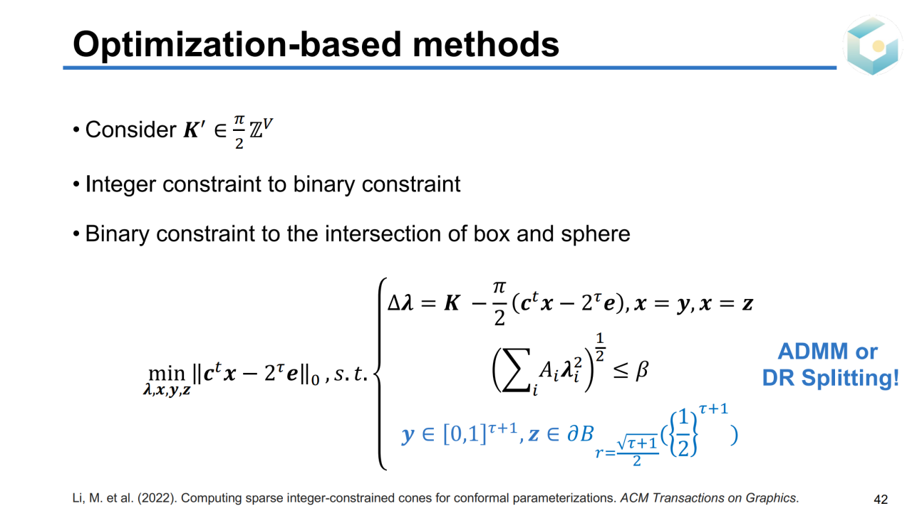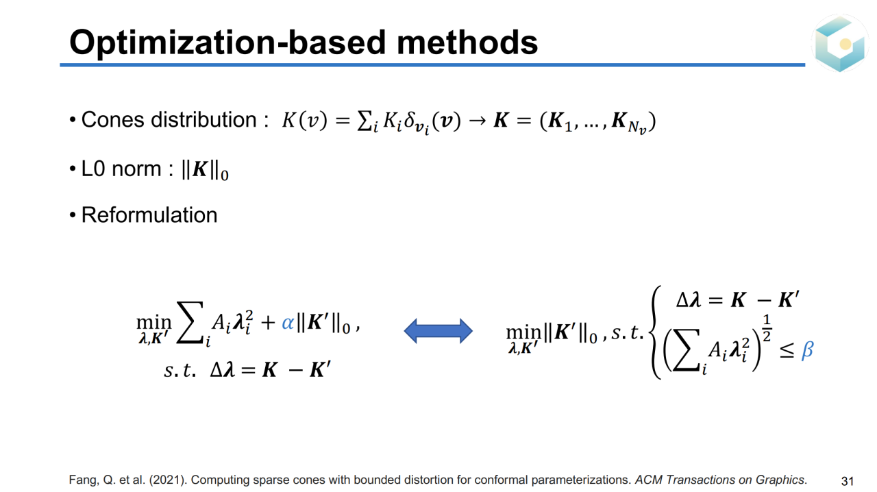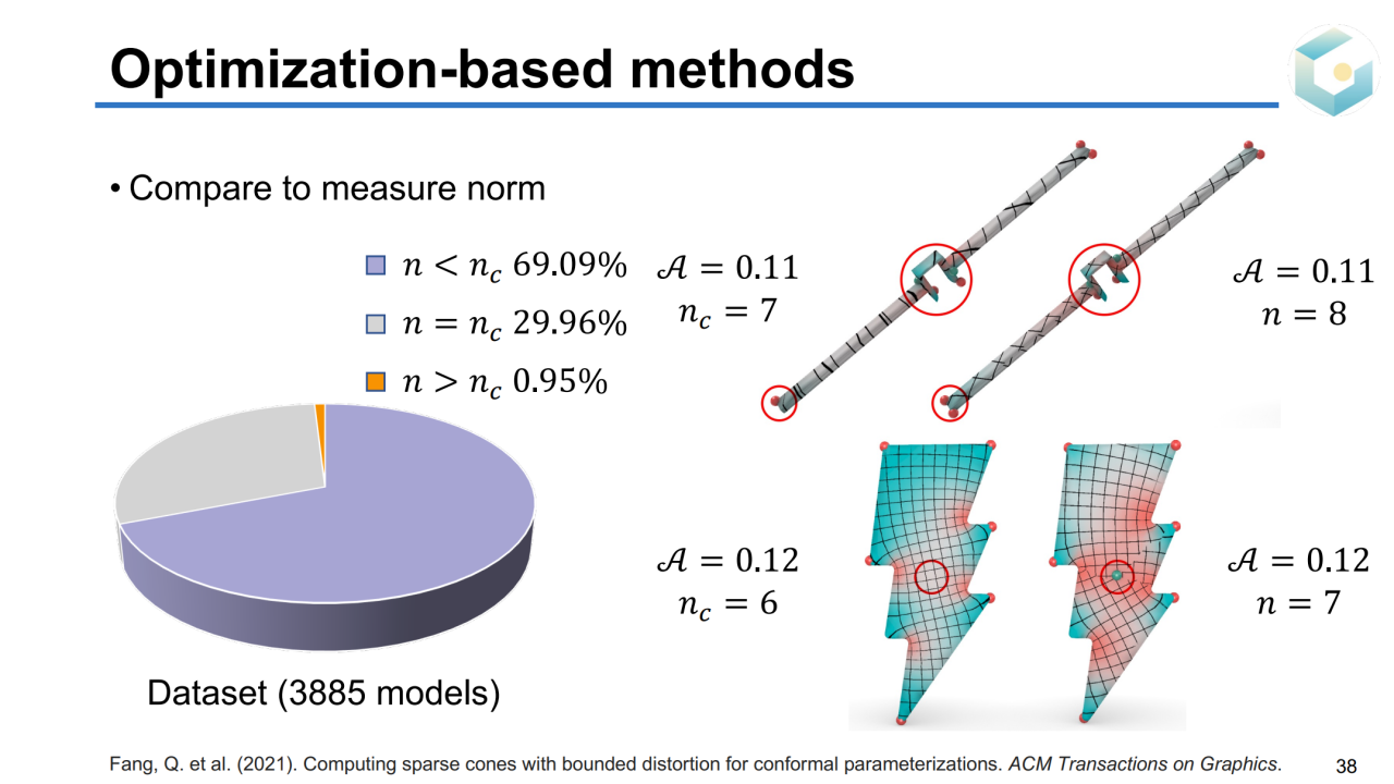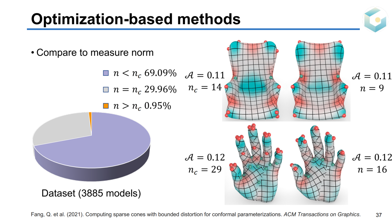 我们希望锥奇异点的数量不要太多,因此优化方法的难点在于如何获得一个稀疏的解。由于锥奇异点的分布可以表示为dirac函数的线性组合,利用函数与测度空间的对偶性可以把原始问题转换到测度空间进行求解。此时只需要优化共形映射的面积扭曲以及加权后的测度模即可,再结合对偶性把它转换为三角面片上函数空间中的优化问题。