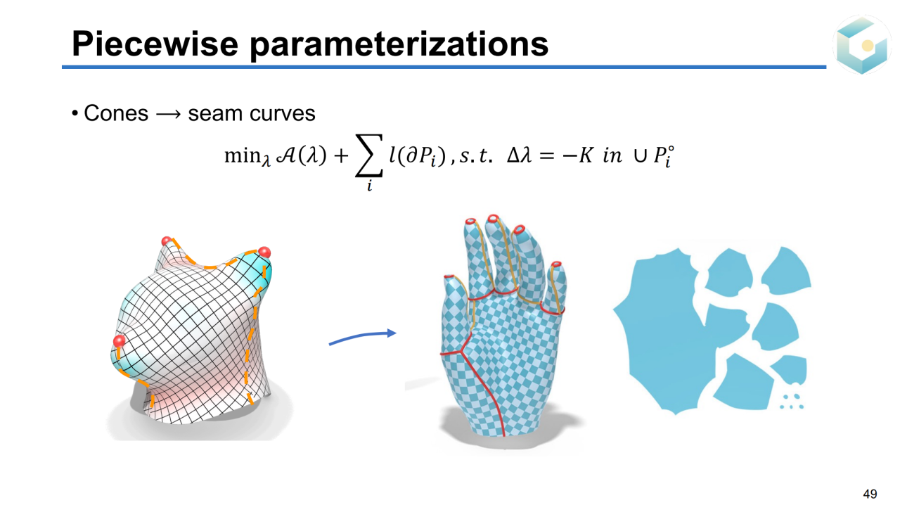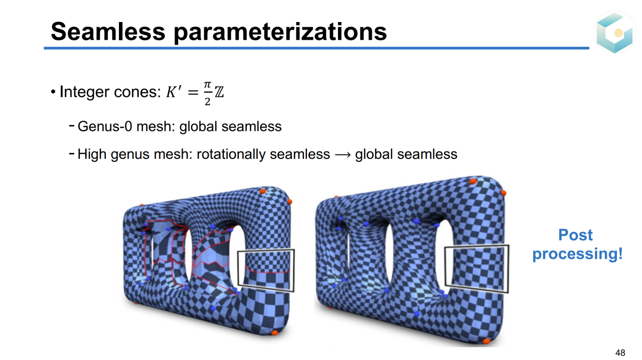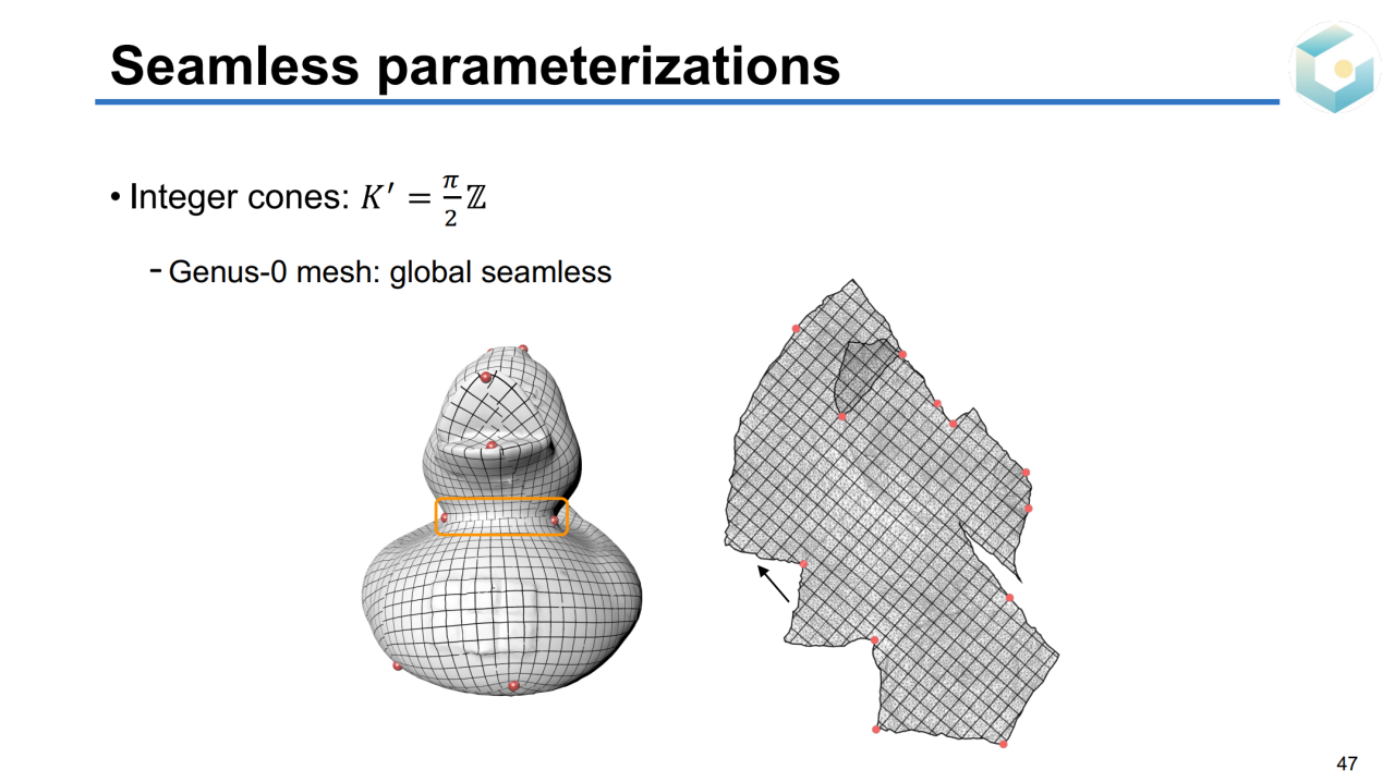 除此之外,如果我们限制锥奇异点上的高斯曲率为\(\frac{\pi}{2}\)的整数倍时会得到一种特殊的参数化,称为旋转无缝参数化(rotational seamless parameterization)。这种参数化可以保证纹理走向在割缝处保持一致,因此它在计算曲面的向量场以及四边形网格的生成等领域都有一定的应用。