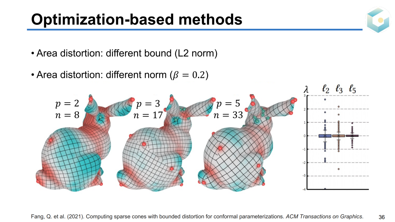 实际应用需要在锥奇异点的数量和面积扭曲之间进行取舍,我们希望在可控的面积扭曲下尽可能少地设置奇异点。这里需要说明的是并不是锥奇异点的数量越多网格参数化的质量就越好。