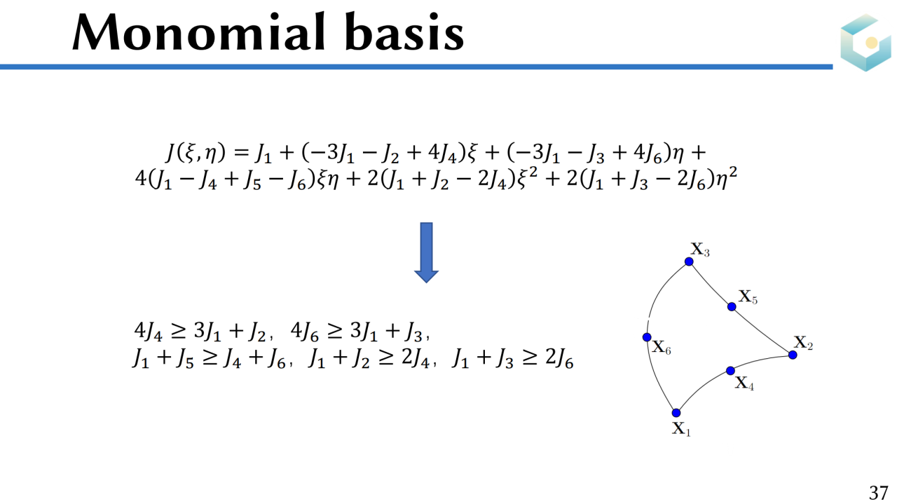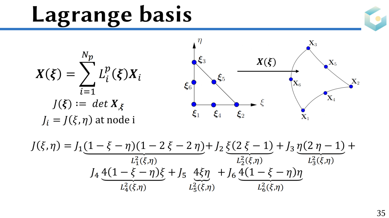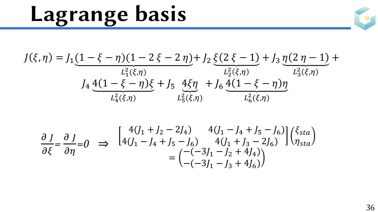 对于Lagrange基,\((\xi, \eta)\)位置上Jacobian矩阵行列式可以按照下面的方法进行展开。展开后要求行列式\(J(\xi, \eta)\)恒为正,此时可以求\(J(\xi, \eta)\)的驻点来进行判断。