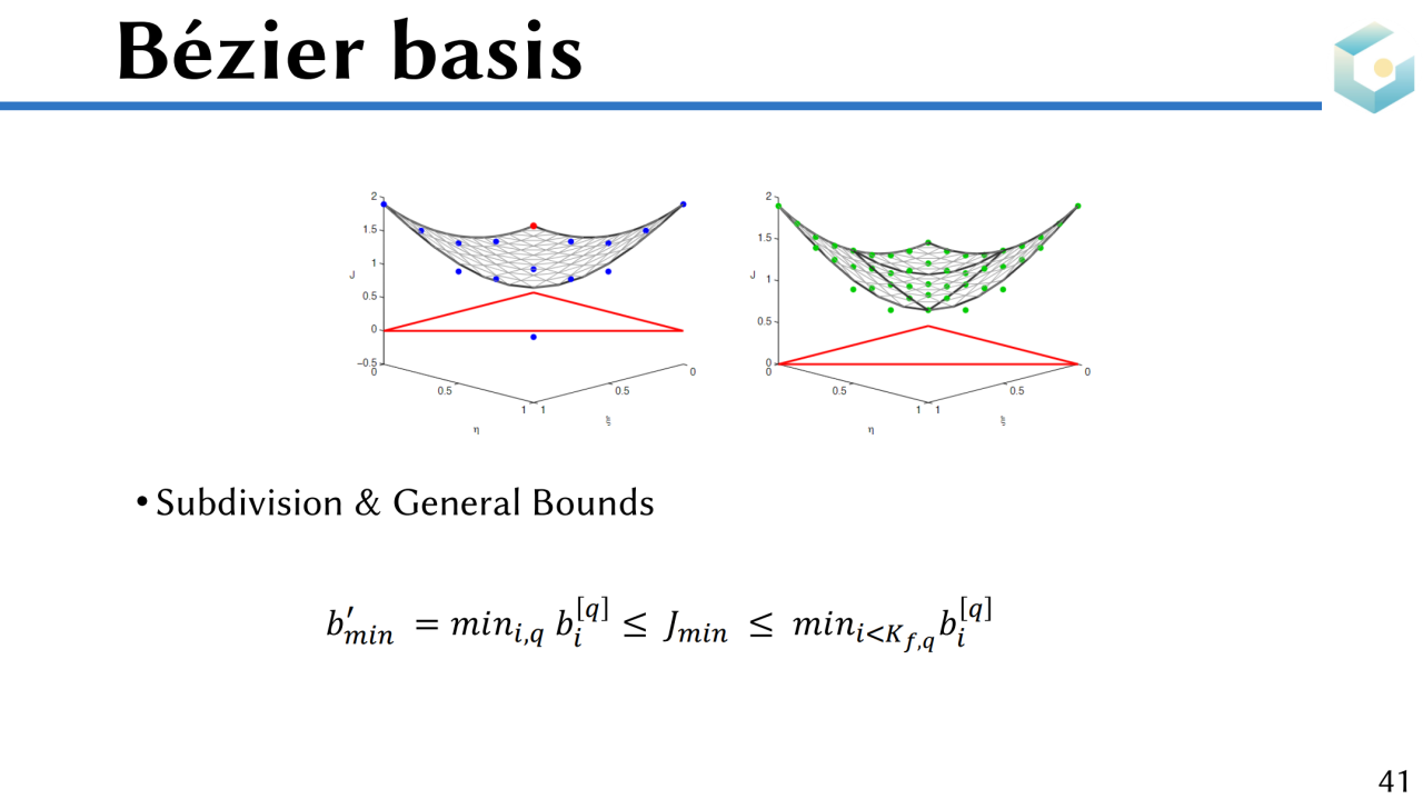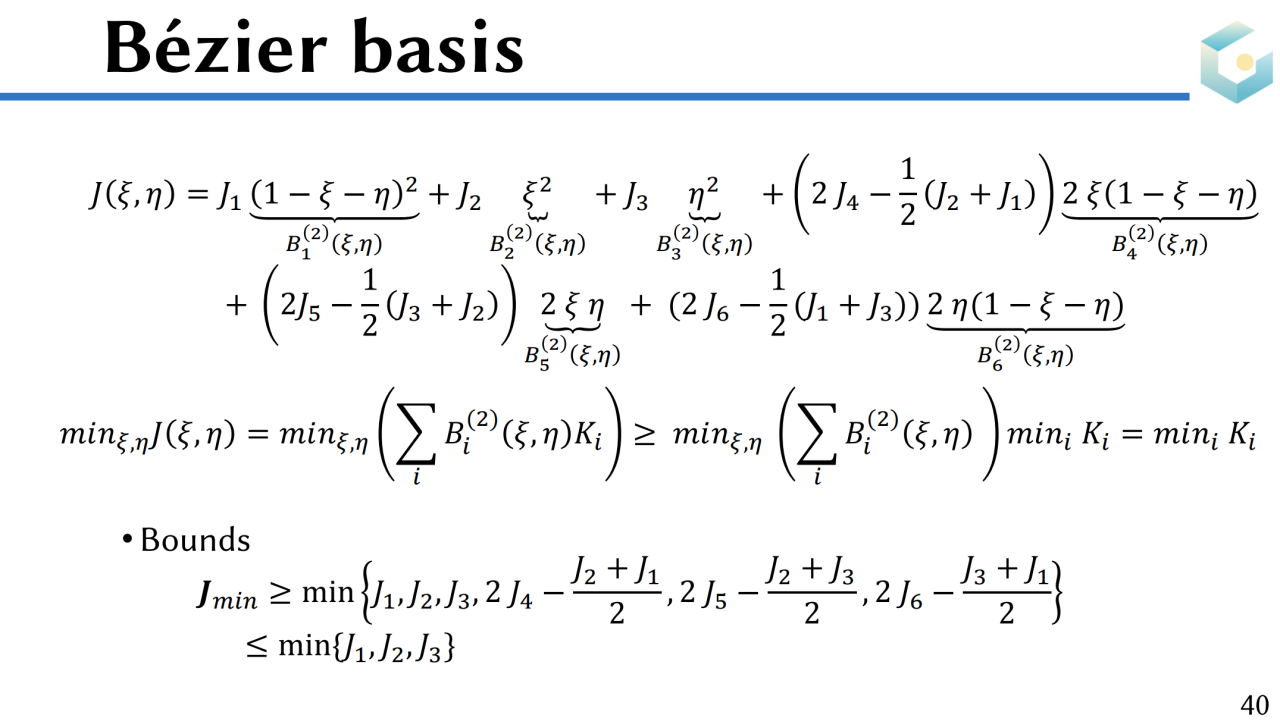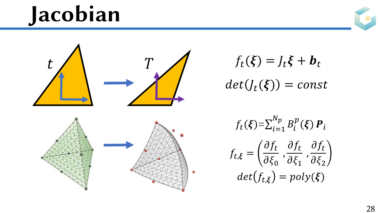 更进一步可以证明整个单元上Jacobian矩阵行列式的下界和上界分别为控制点构成的凸包以及三个角点中的最小值,这样只需要控制上界和下界就可以保证单元上无翻转。除此之外还可以通过对Bézier基进行细分来辅助判断。