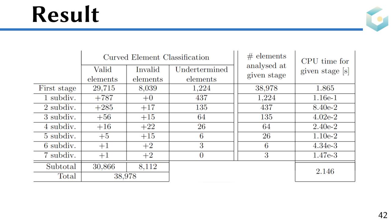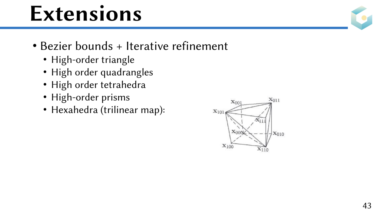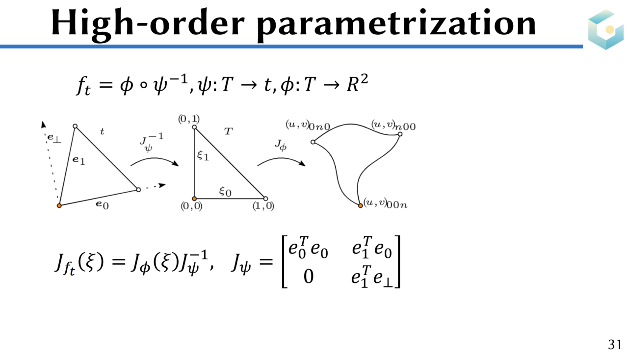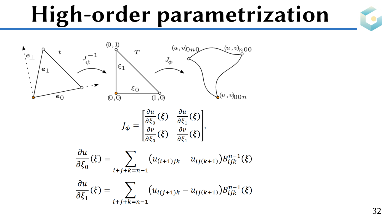 更进一步可以证明整个单元上Jacobian矩阵行列式的下界和上界分别为控制点构成的凸包以及三个角点中的最小值,这样只需要控制上界和下界就可以保证单元上无翻转。除此之外还可以通过对Bézier基进行细分来辅助判断。