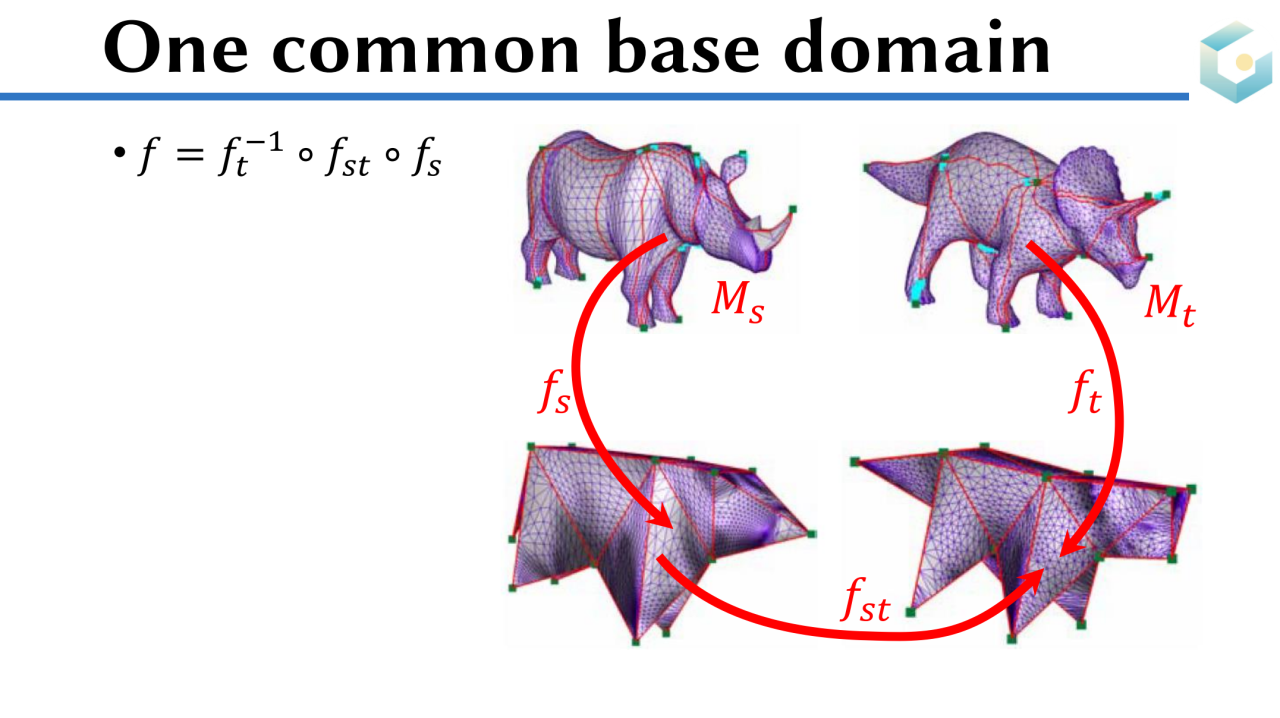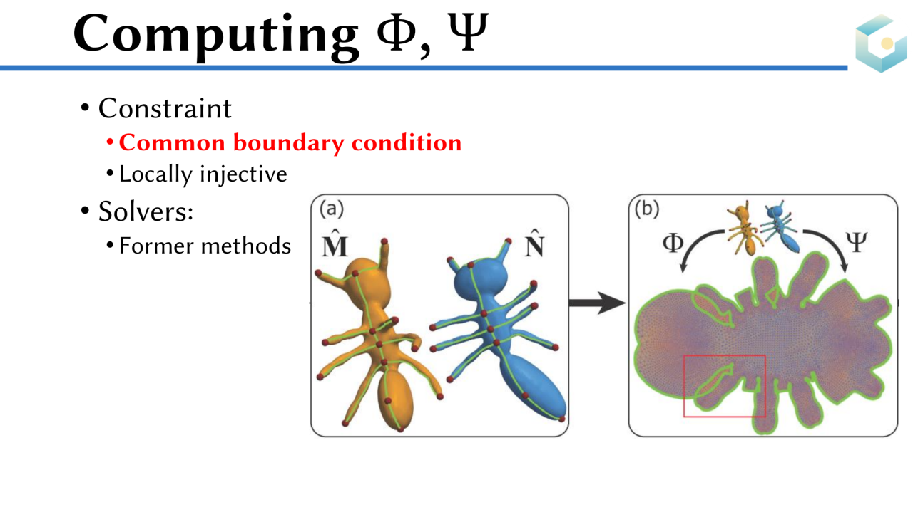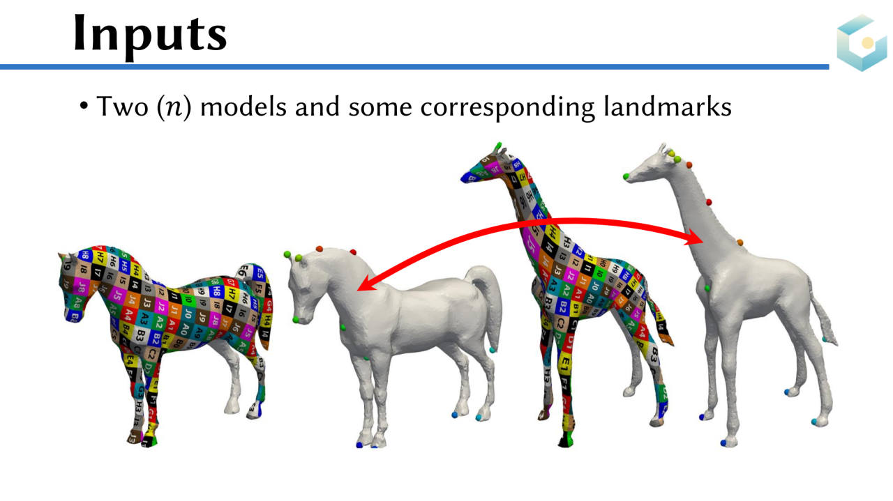 在很多情况下直接构造公共域是比较困难的。为了处理这样的问题可以利用一一对应的landmark来进行构造,具体来说首先将landmark连接成线然后利用landmark之间的路径来建立一一映射。在这些对应的连线上计算共同边界的参数化就将两个网格都映射到公共域上。需要额外注意的是共同边界的参数化可能无法保证不出现翻转。