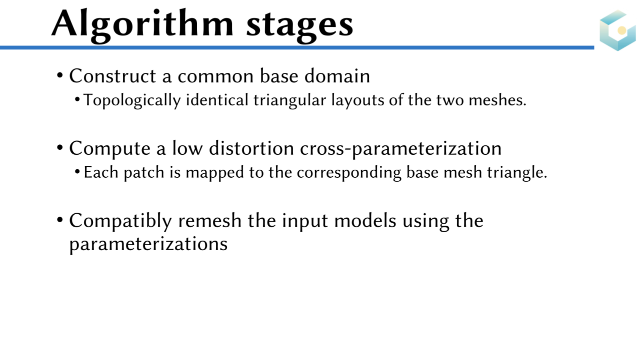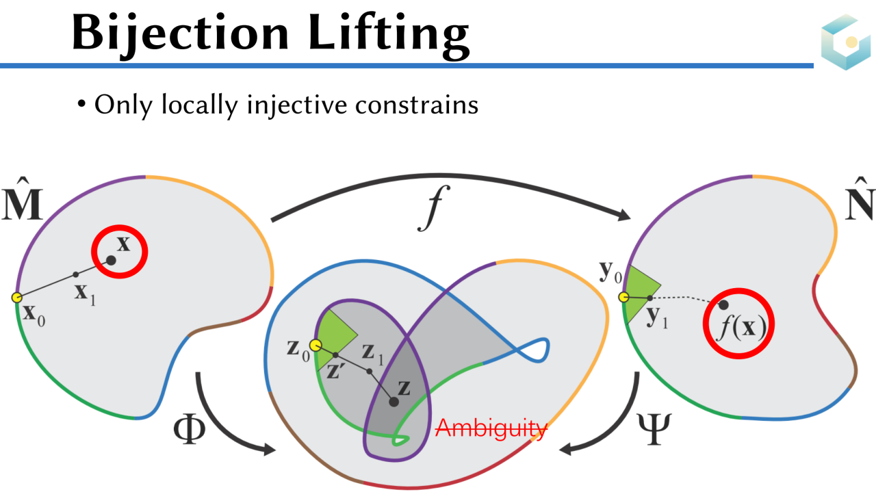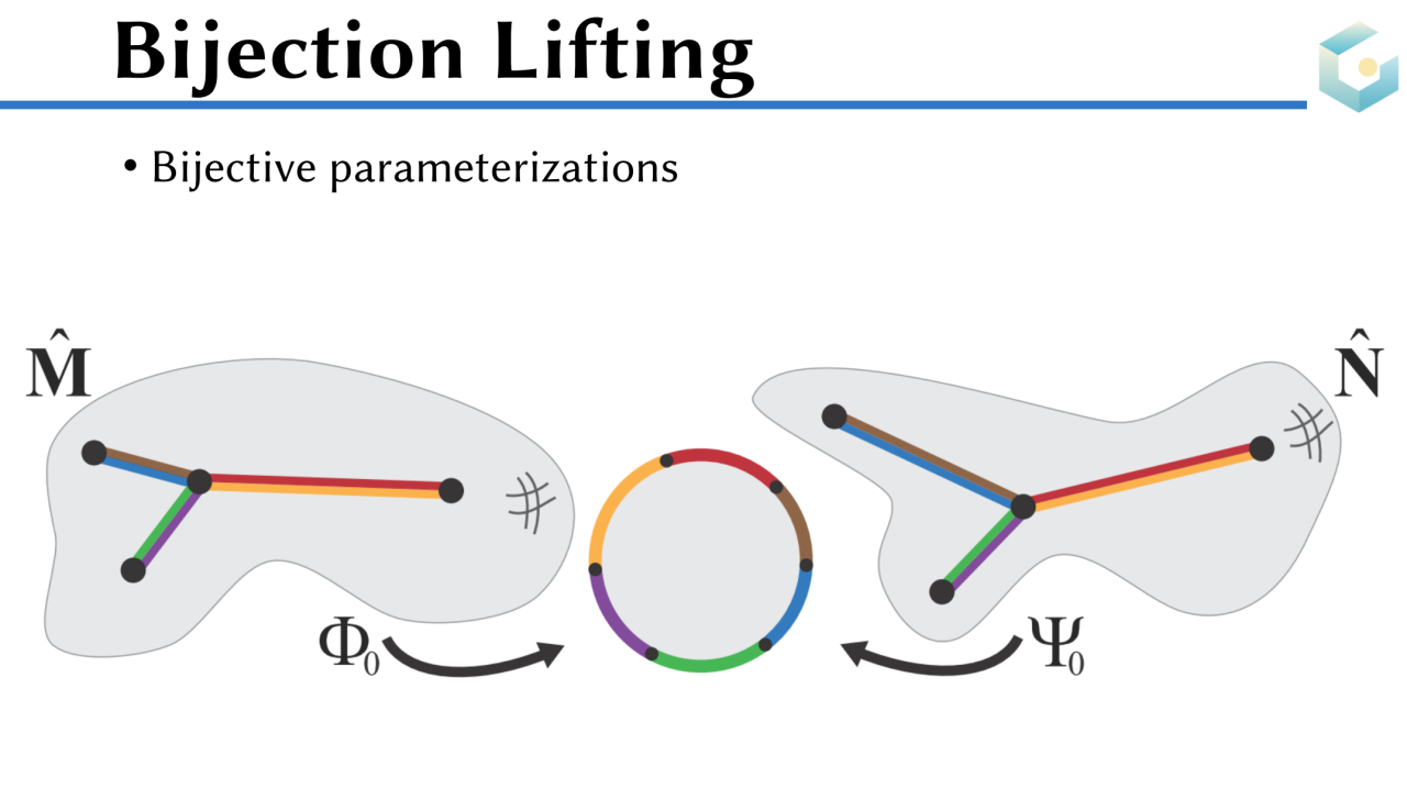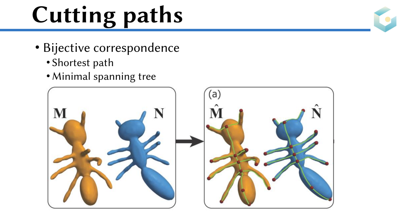 在很多情况下直接构造公共域是比较困难的。为了处理这样的问题可以利用一一对应的landmark来进行构造,具体来说首先将landmark连接成线然后利用landmark之间的路径来建立一一映射。在这些对应的连线上计算共同边界的参数化就将两个网格都映射到公共域上。需要额外注意的是共同边界的参数化可能无法保证不出现翻转。