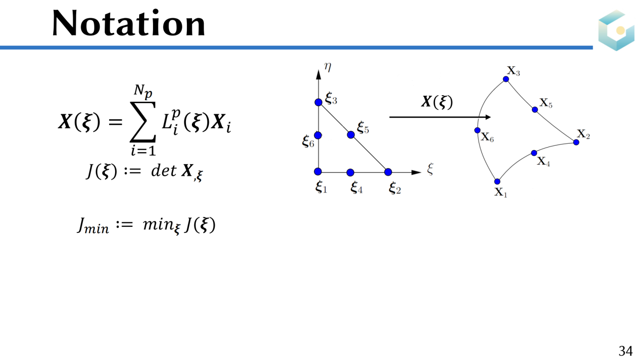 与一阶线性单元不同的是当单元发生变形时单元内\(\xi\)位置的Jacobian矩阵不再是一个常数,而是一个关于\(\xi\)的矩阵,对应的行列式则为关于\(\xi\)的一个多项式。如果我们要求单元内部不发生翻转,则需要保证Jacobian矩阵的行列式在任意位置恒大于0,即多项式的最小值大于0。